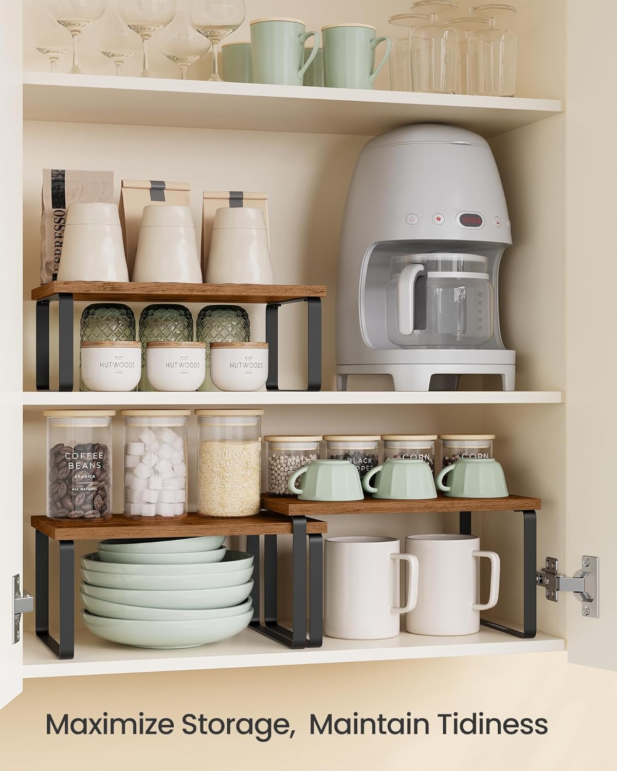 SONGMICS Cabinet Organizer Shelf, Set of 3 Kitchen Counter Shelves, Kitchen Storage, Spice Rack, Stackable, Expandable, Rustic Brown and Matte Black UKCS220K02