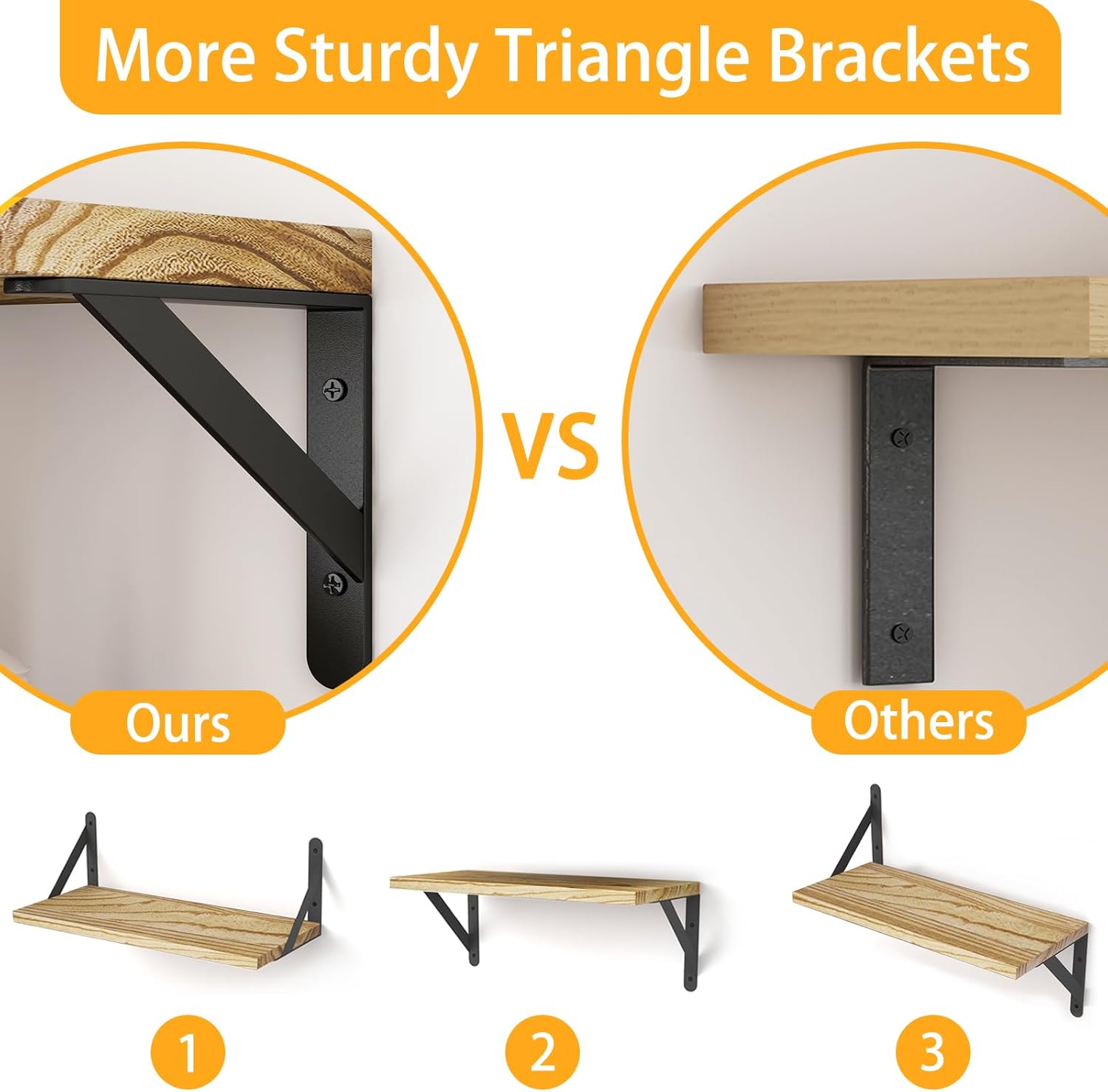 - ăSturdy & Easy to AssembleăThe Triangle shaped metal brackets are more sturdy, with a capacity of 40Lb. YGEOMER wood floating wall shelves for bathroom are super sturdy, very easy to install, all hardware and user manual was included.