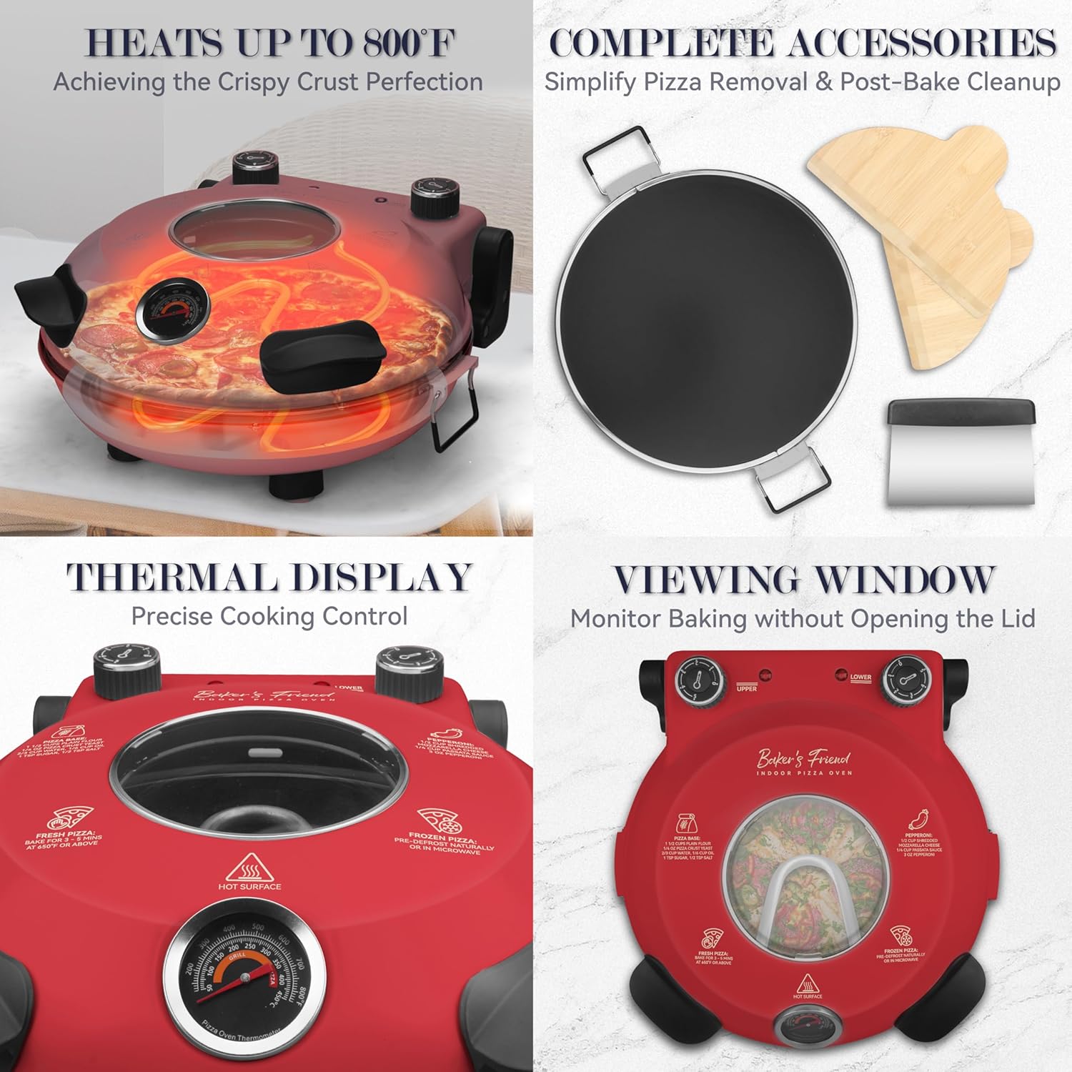 Baker’s Friend Electric Pizza Oven Indoor Countertop, 12 Inch Pizza Maker Machine for Home, Pizza Cooker & Pizza Grill, Premium Glazed Ceramic Stone Pizza Oven, Chilli Red