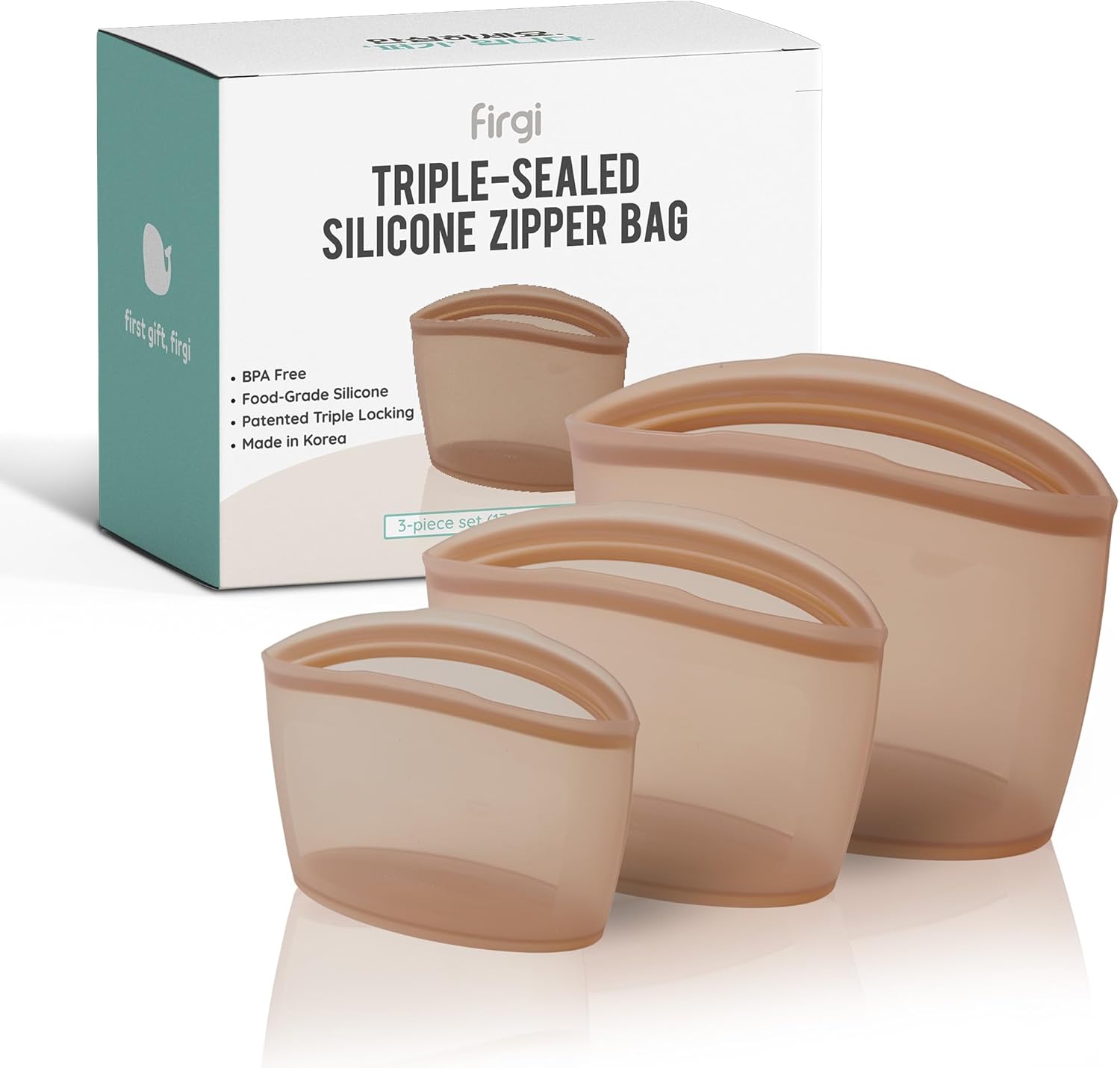 Reusable Silicone Food Storage Bags 3Set Airtight food Storage Containers Food Grade Silicone Snack Bags, BPA Free Food Storage Container, Microwave Safe, Sous Vide Container, Brown, 17oz+29oz+51oz