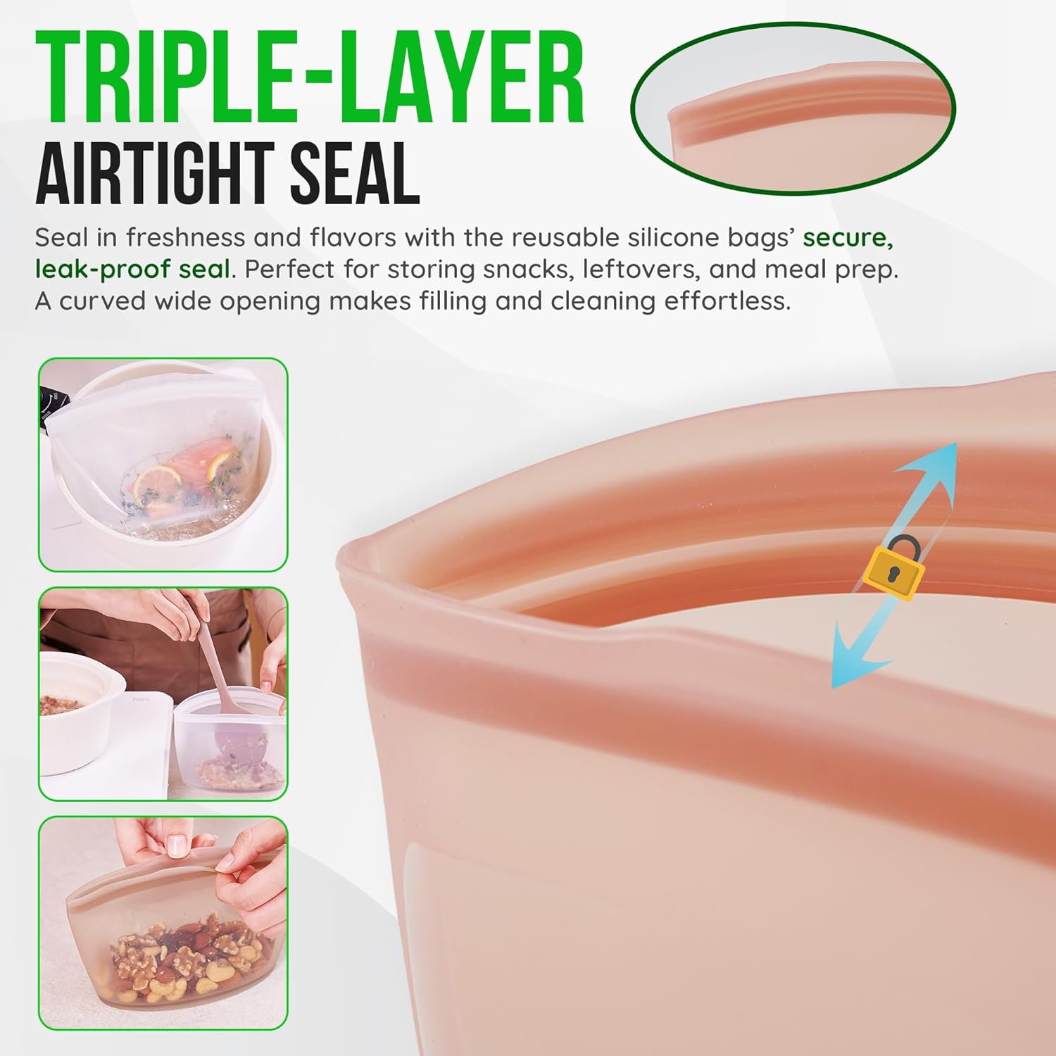 - Triple-Layer Airtight Seal: Seal in freshness and flavors with the reusable silicone bags’ secure, leak-proof seal- perfect for storing snacks, leftovers, and meal prep. A curved wide opening makes filling and cleaning effortless