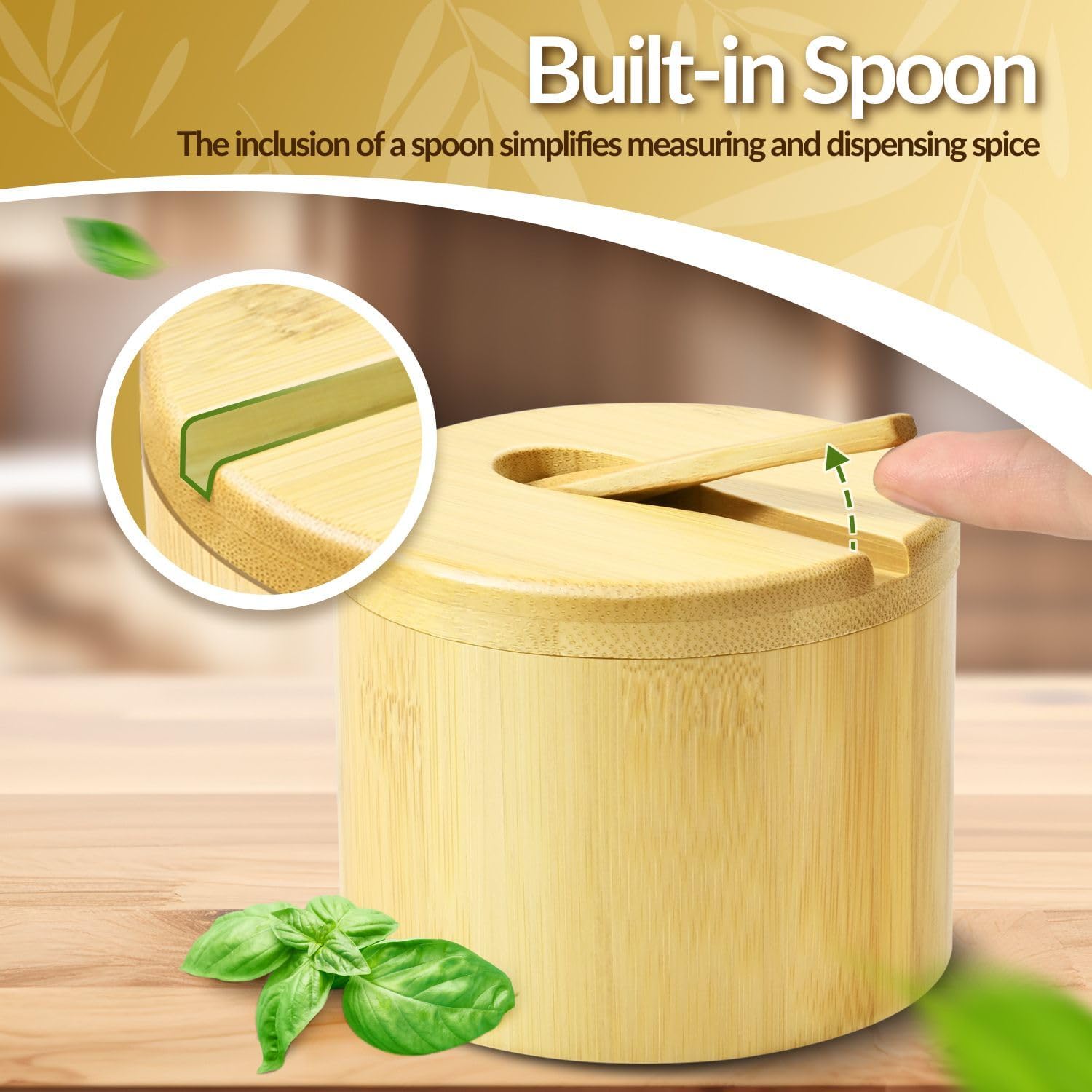 - Bamboo Material Advantage: This salt bowl with lid and spoon is crafted from durable and eco-friendly bamboo. Our stylish and functional salt box with swivel lid adds charm to the kitchen, grill, or dining table