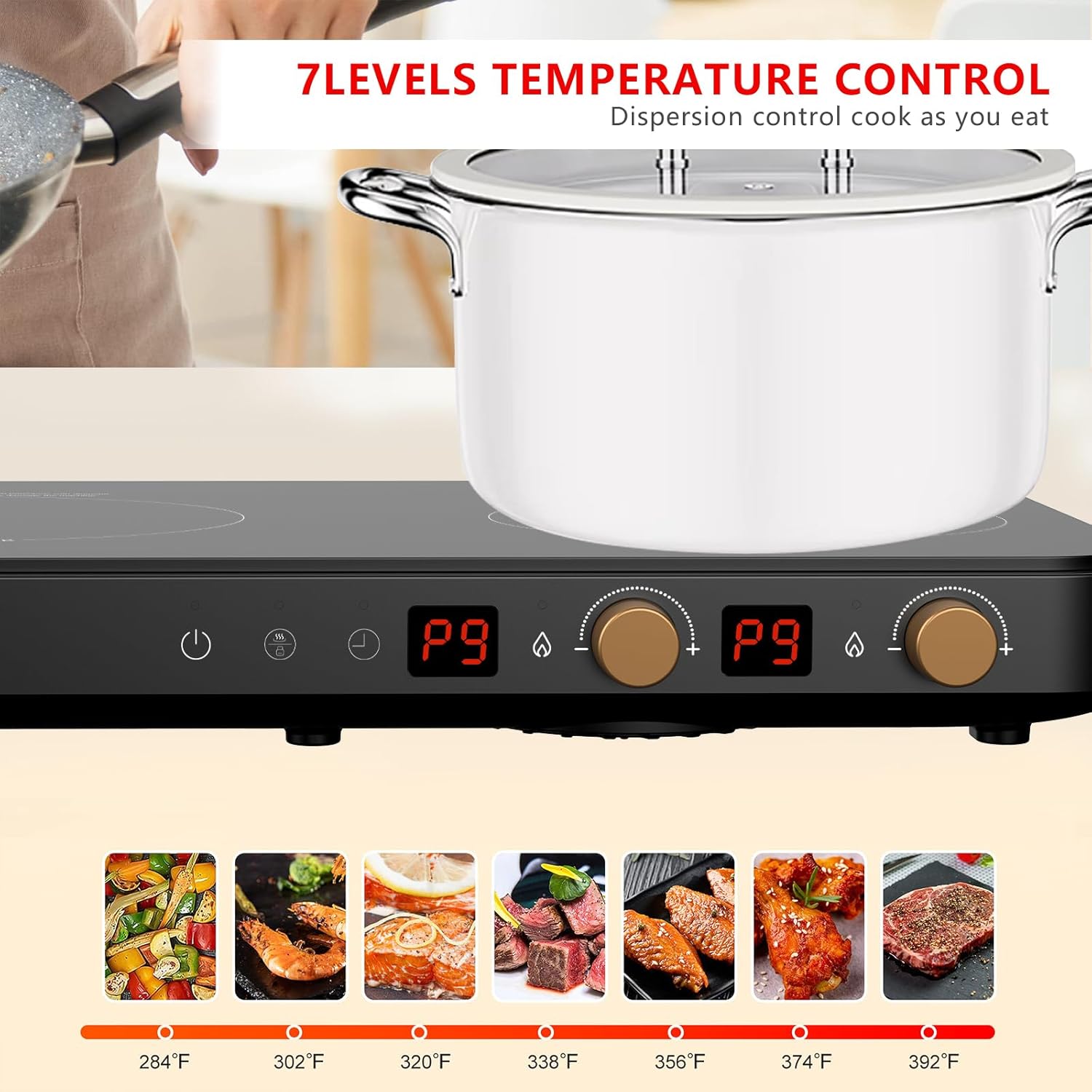 - Multifunctional 2-in-1 induction cooker with grill: A new favorite for cooking, enjoy convenient and delicious multifunctional cooking modes, switch at will, this portable induction cooker 2 burners with a removable cast iron grill. It can be used as an ideal alternative to indoor electric grills, and can also be used as a standalone induction cooker. Whether it is frying delicious pancakes, sausages, steaks, or tender eggs, the food will not stick to the grill, meeting your diverse cooking needs.