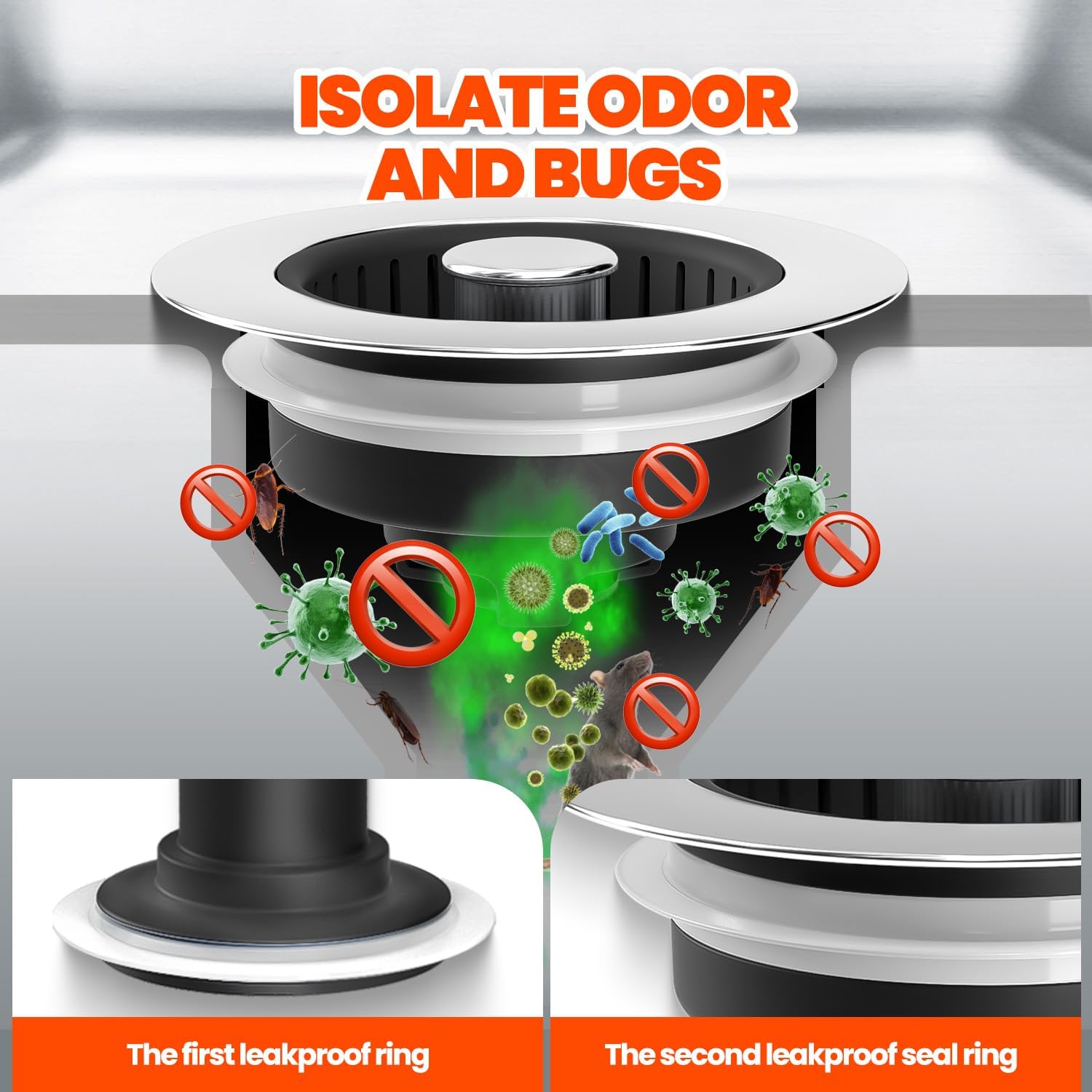 - Innovative 3-in-1 Functionality:Our 3-in-1 Kitchen Sink Drain Strainer combines a drain strainer, sink stopper, and odor isolation for seamless functionality. With a single press, switch between water retention and efficient drainage while preventing debris clogs.