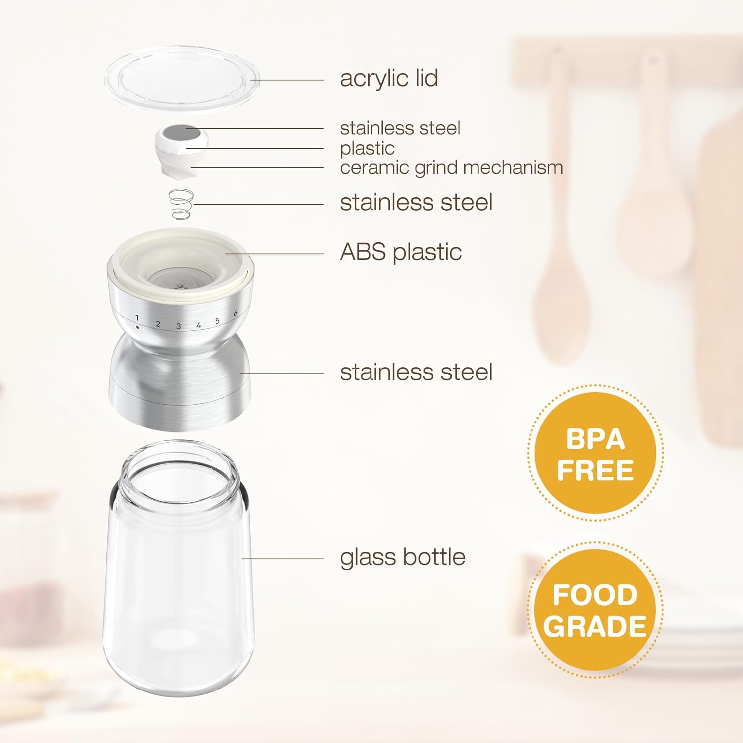 - External Adjustment & Double Sphere Effortless Design - The external adjustment design allows you to change the grinding coarseness without opening the grinder. Keep your hands clean. The kitchen pepper grinder features a Double Sphere design for effortless, comfortable grinding