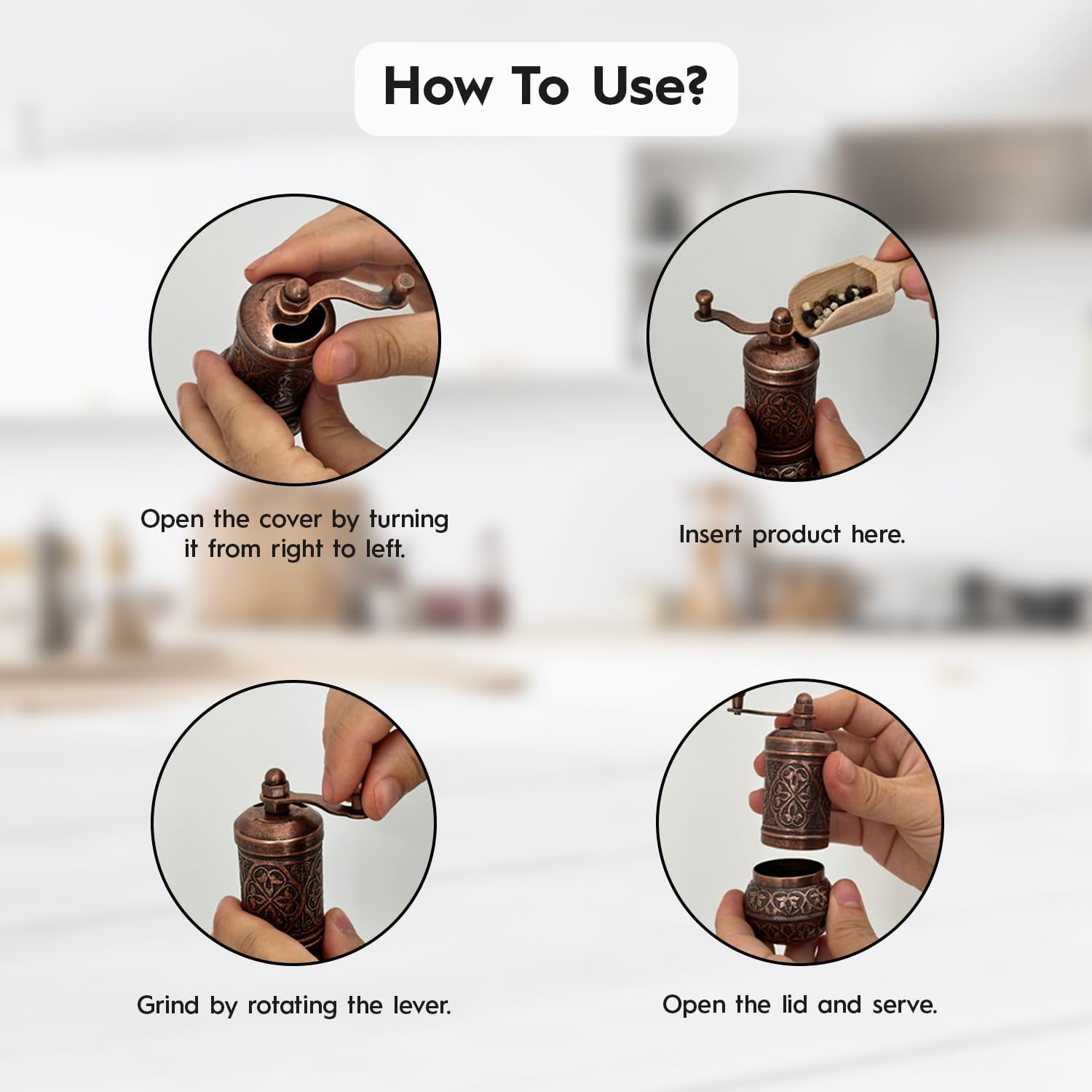 Decorative Handmade Black Pepper Grinder, Refillable Turkish Spice Mill with Adjustable Coarseness, Manual Pepper Mill with Handle, Spice Grinder with Hand Crank 8 cm-3.1 inch