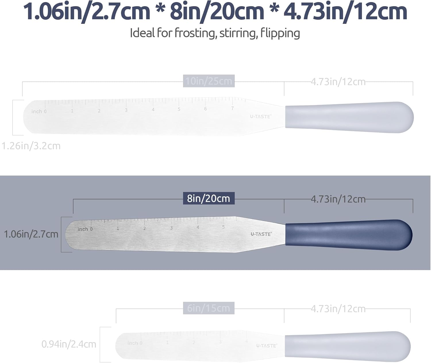 - Sturdy Anti-Rust Stainless Steel Blades: U-Taste icing spatulas feature firm blades crafted from high-quality 18/0 stainless steel, ensuring durability and resistance to rust. The blades are not too wide, allowing for precise control while decorating. With its brushed surface, the frosting knife resists rust spots and ensures easy cleaning, even after being washed in the dishwasher. And the smooth and rounded edges can prevent hand injuries, ensuring safe and comfortable use.