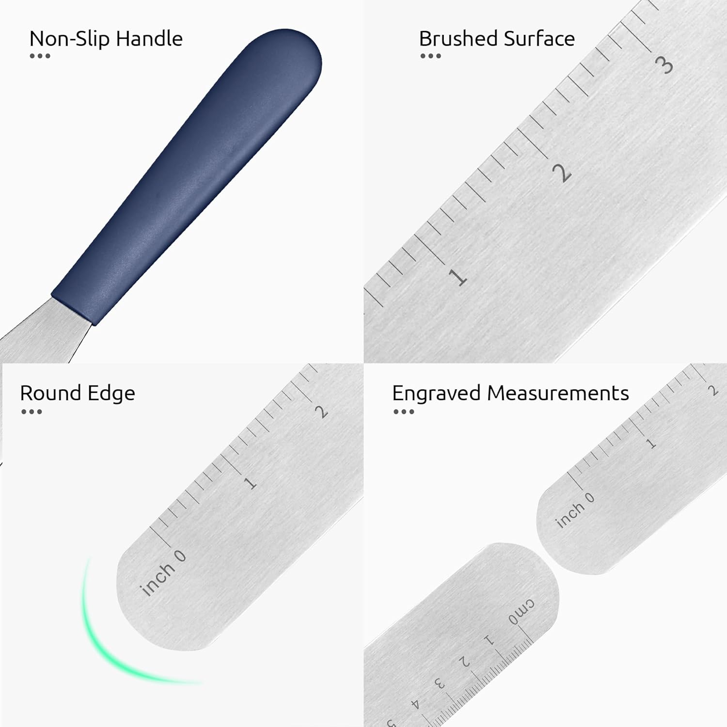 - Sturdy Anti-Rust Stainless Steel Blades: U-Taste icing spatulas feature firm blades crafted from high-quality 18/0 stainless steel, ensuring durability and resistance to rust. The blades are not too wide, allowing for precise control while decorating. With its brushed surface, the frosting knife resists rust spots and ensures easy cleaning, even after being washed in the dishwasher. And the smooth and rounded edges can prevent hand injuries, ensuring safe and comfortable use.