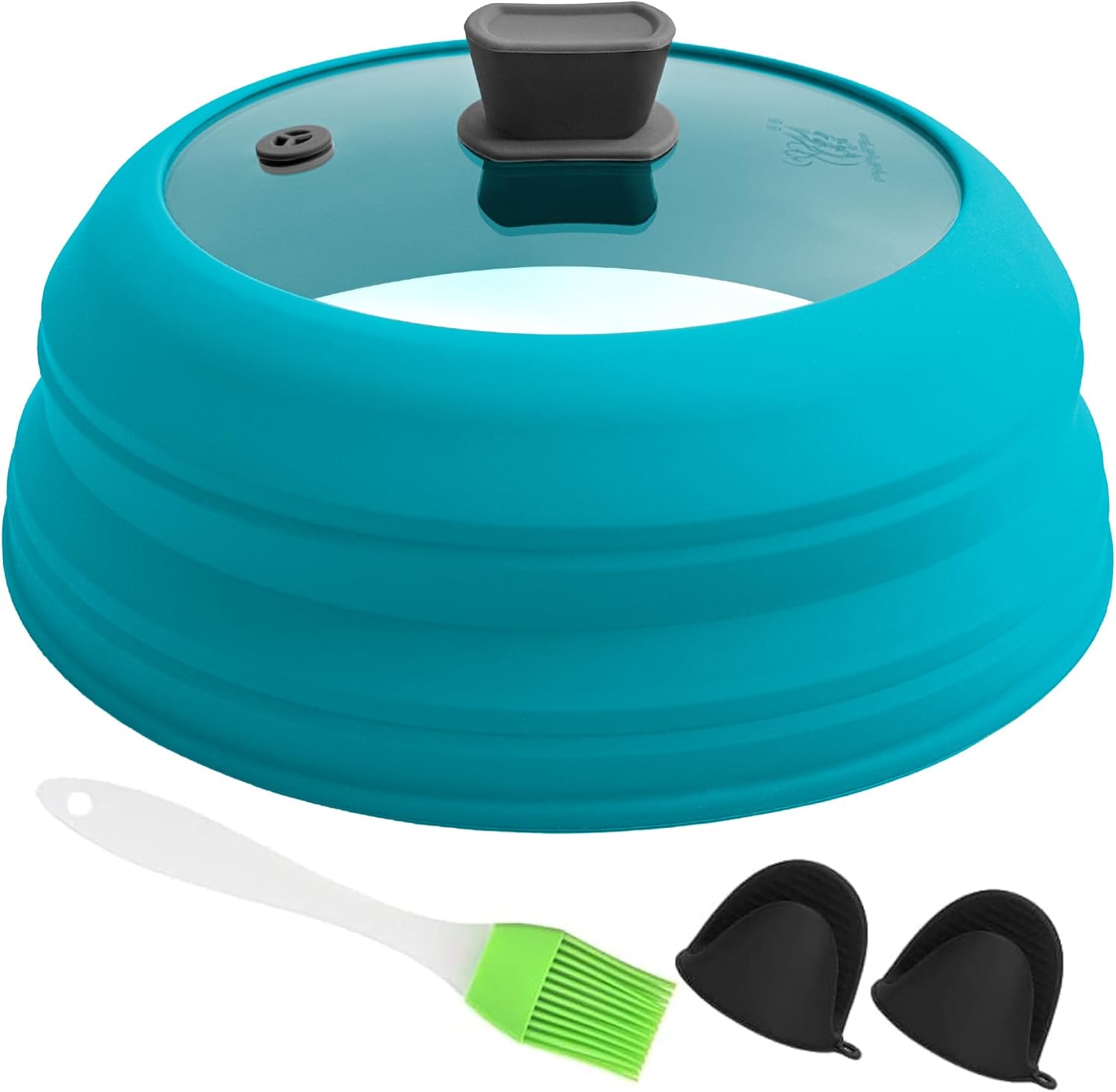 Microwave Splatter Cover Glass Microwave Cover for Food Collapsible Splatter Guard Lid with Silicone Handle for Pot Plate Bowl 11.8 Inch Blue