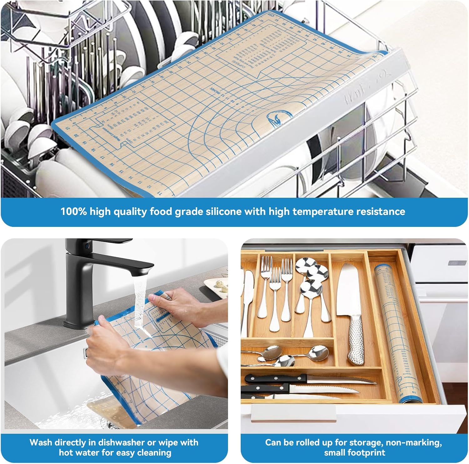 - 【Easy to Clean Up and Anti-slip Bottom】 Even if the pastry mat is covered with grease or raw flour,Just rinse and wipe with soapy hot water,less mess for your doughs lift and much convenient for clean-up for daily use.The dough mat is super non-slip, even when kneading and rolling on it, dough mat will not shift its position and can fit firmly with the countertop.