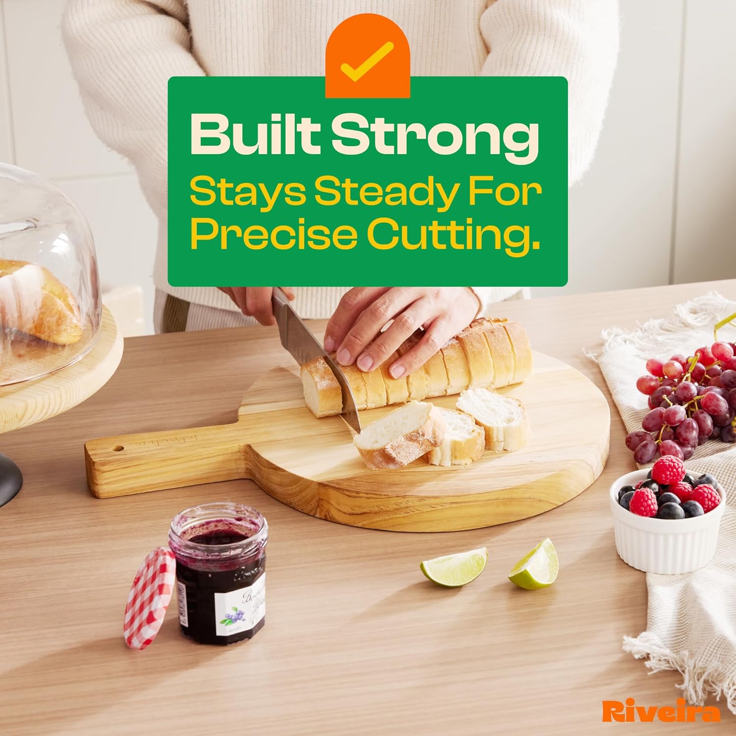 - Premium Crafted Teak — Take a detour from traditional kitchen aesthetics with this teak wood board crafted from 100% natural teak. Beyond being an unconventional and eco-friendly choice, the chopping board wood proudly showcases the environment friendly and organic teak. This wood cutting boards for kitchen counter adds an unexpected touch of confidence and style to your once-orderly culinary space. Riviera's wooden chopping boards for kitchen will be there for you for many years to come.