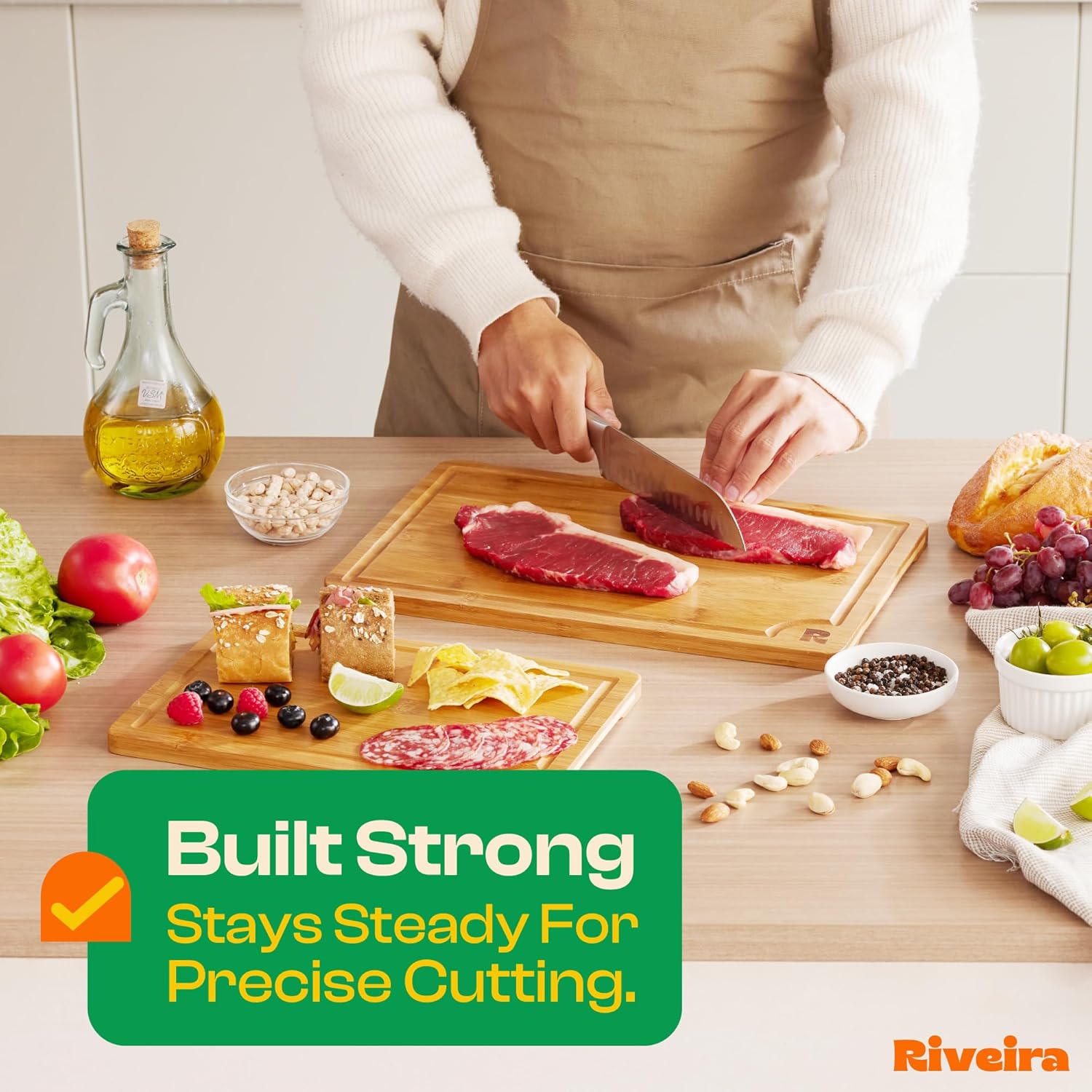 - No Mess Cutting and Transfer — Enjoy a mess-free kitchen with our Brown large bamboo cutting board. Equipped with deep juice grooves, these wooden cutting boards set catch liquid runoff from meat and fruit, preventing spills and countertop messes. Whether you're working in an industrial restaurant kitchen or your home, this dark wood cutting board set of 2 makes cleanup a breeze. Transfer ingredients from your prep station without any fuss with Riveira nice cutting board set for different foods.