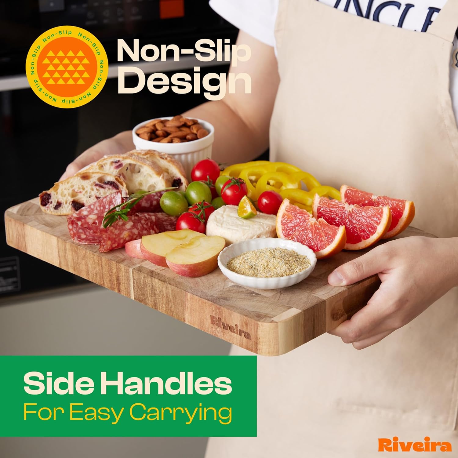 - Premium Crafted Acacia — Take a detour from traditional kitchen aesthetics with this acacia wood board crafted from 100% natural acacia. Beyond being an unconventional and eco-friendly choice, the chopping board wood proudly showcases the environment friendly and organic acacia. This wood cutting boards for kitchen counter adds an unexpected touch of confidence and style to your once-orderly culinary space. Riviera's wooden chopping boards for kitchen will be there for you for many years.
