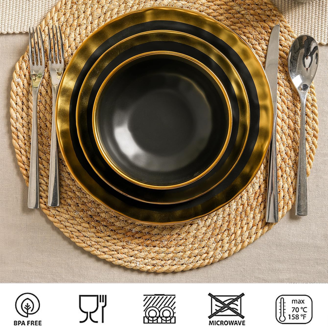 vicrays Ceramic Salad Bowls Set for Kitchen, Serving - 24 Ounce Soup Bowls, Pasta Bowls, Chip Resistant, Dishwasher Safe, NOT Microwave Safe, Fluted, Stoneware, Set of 6 (Black with Golden)