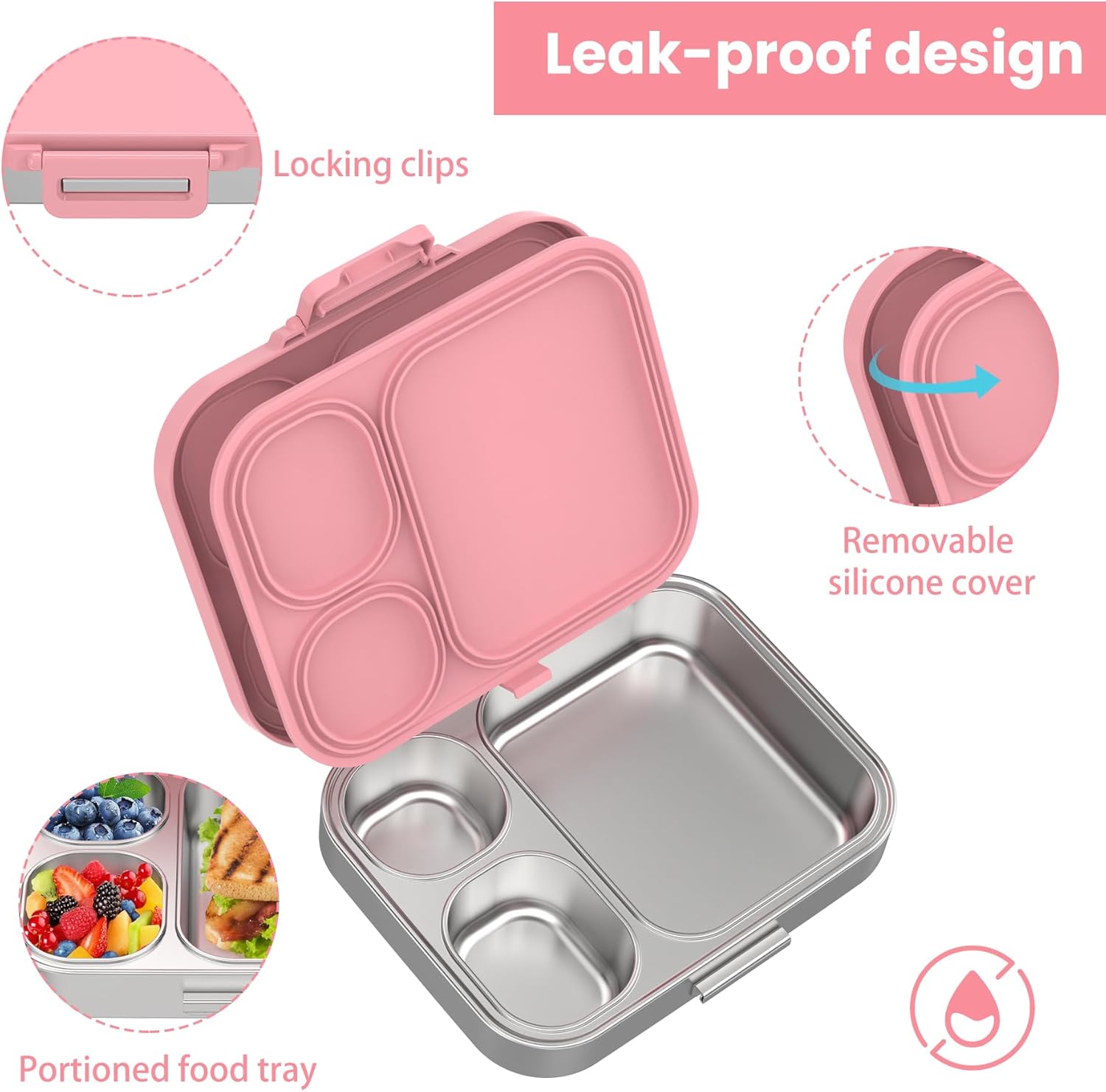 Stainless Steel Bento Lunch Box for Kids | 3-Compartment Lunch Box Container Kids | 100% Leakproof, Dishwasher-Safe, Eco-Friendly, Perfect Portion Control for Kids&Adult Healthy Meals (Pink)