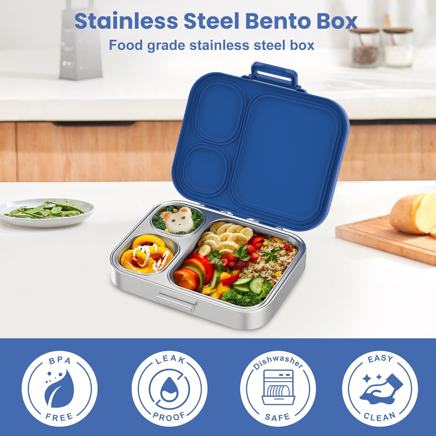 Stainless Steel Bento Lunch Box for Kids | 3-Compartment Lunch Box Container Kids | 100% Leakproof, Dishwasher-Safe, Eco-Friendly, Perfect Portion Control for Kids&Adult Healthy Meals (Blue)
