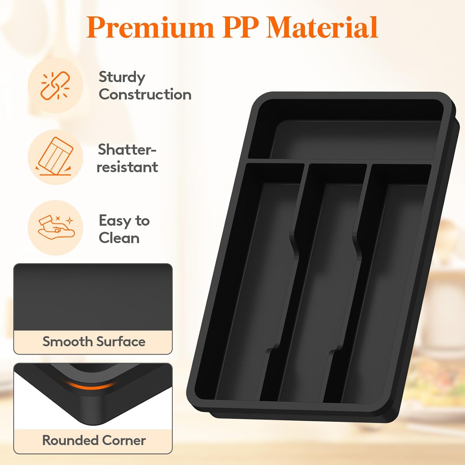 - Robust and Safe: This kitchen drawer organizer is crafted from premium PP material, BPA-free and built to last. It ensures your silverware is stored in a healthy, safe environment for worry-free use