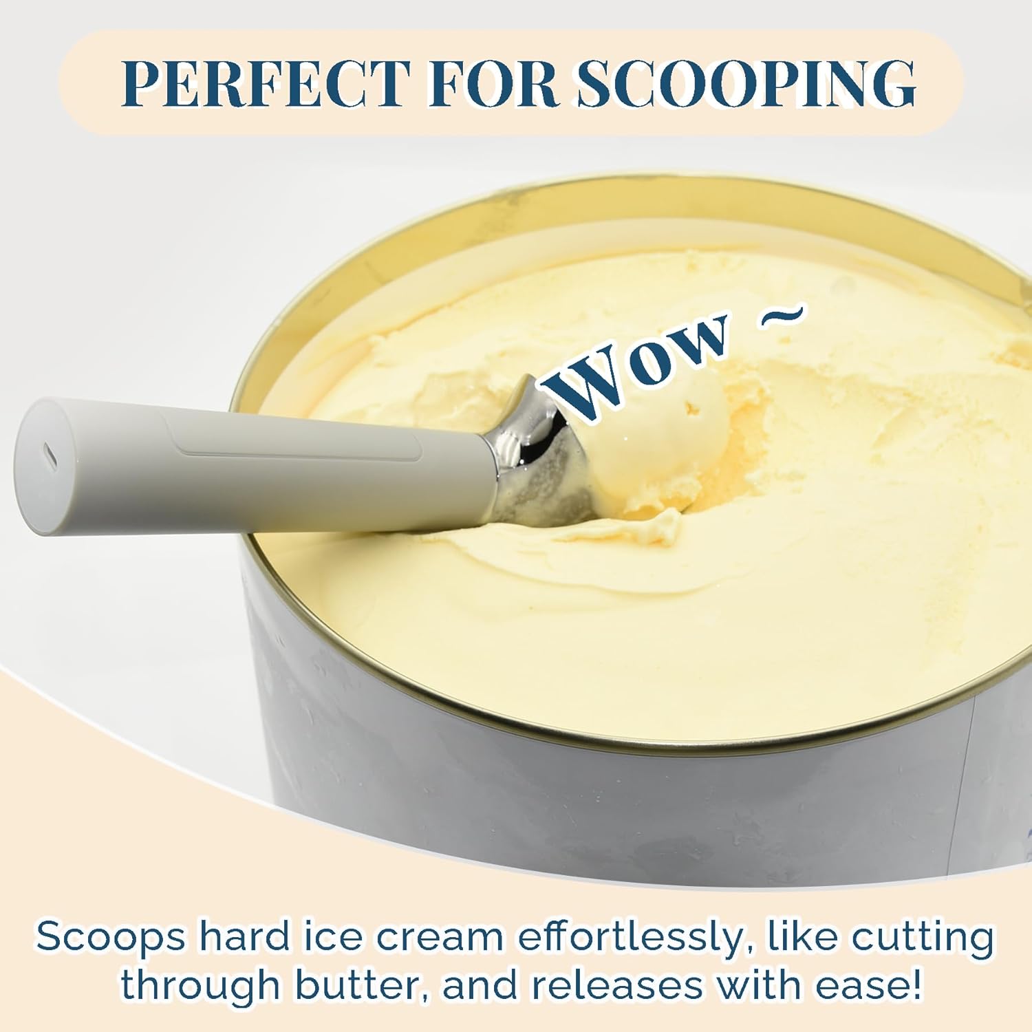 - [Effortless Hard Ice Cream Scooping] – No more bending spoons or waiting for ice cream to thaw. This heated ice cream scoop warms up quickly to 158°F, letting you glide through even rock-solid ice cream straight from the freezer. Just grip the handle to activate heating — no buttons required. It continues warming for 40 seconds after use, making every scoop smooth and simple. Perfect for ice cream, gelato, or frozen yogurt