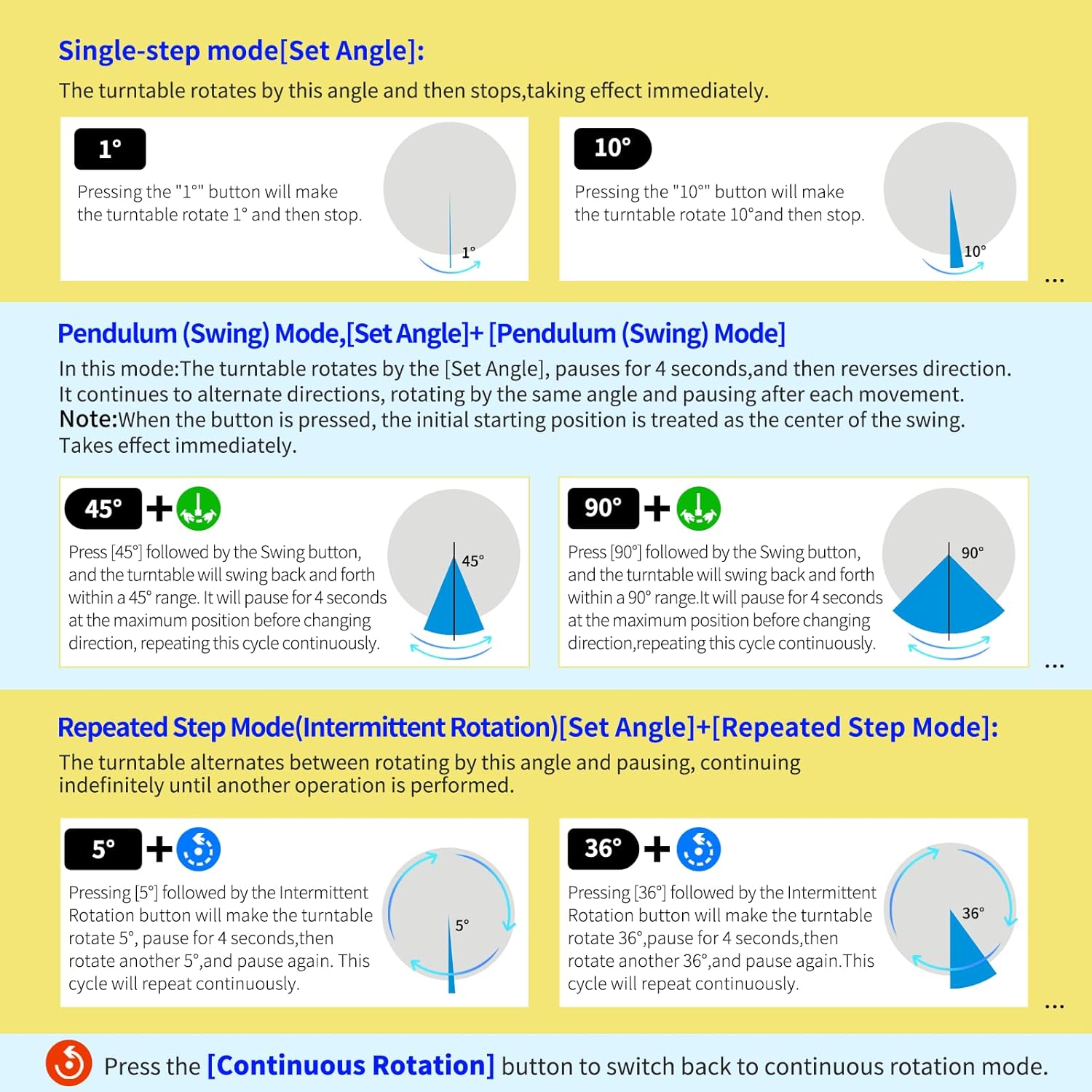 - 【This Electric turntable includes a Professional Flagship Remote Controller】:Precise angle settings and user-friendly combination key design enable support for a wider range of applications. Support: Set the current position as the origin point (used in conjunction with the "Return to Origin" button). Support: Save the current settings to the turntable's internal flash. More versatile angle buttons and mode button combinations provide greater flexibility for various applications