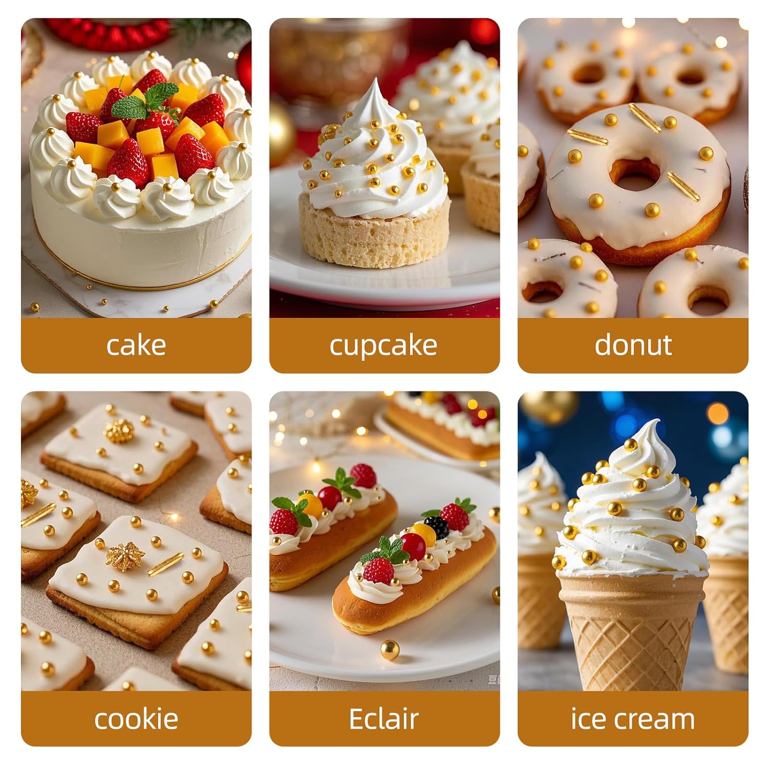 - Versatile Dessert Decoration: Our sprinkles includes different sizes of gold beads and rods, perfect for meeting all your baking decoration needs.The sugar decorations are edibled candies. It is normal for large candies to have a hard texture and can be eaten with confidence.After baking, decorate the cookies or cake with pearl sugar to avoid melting
