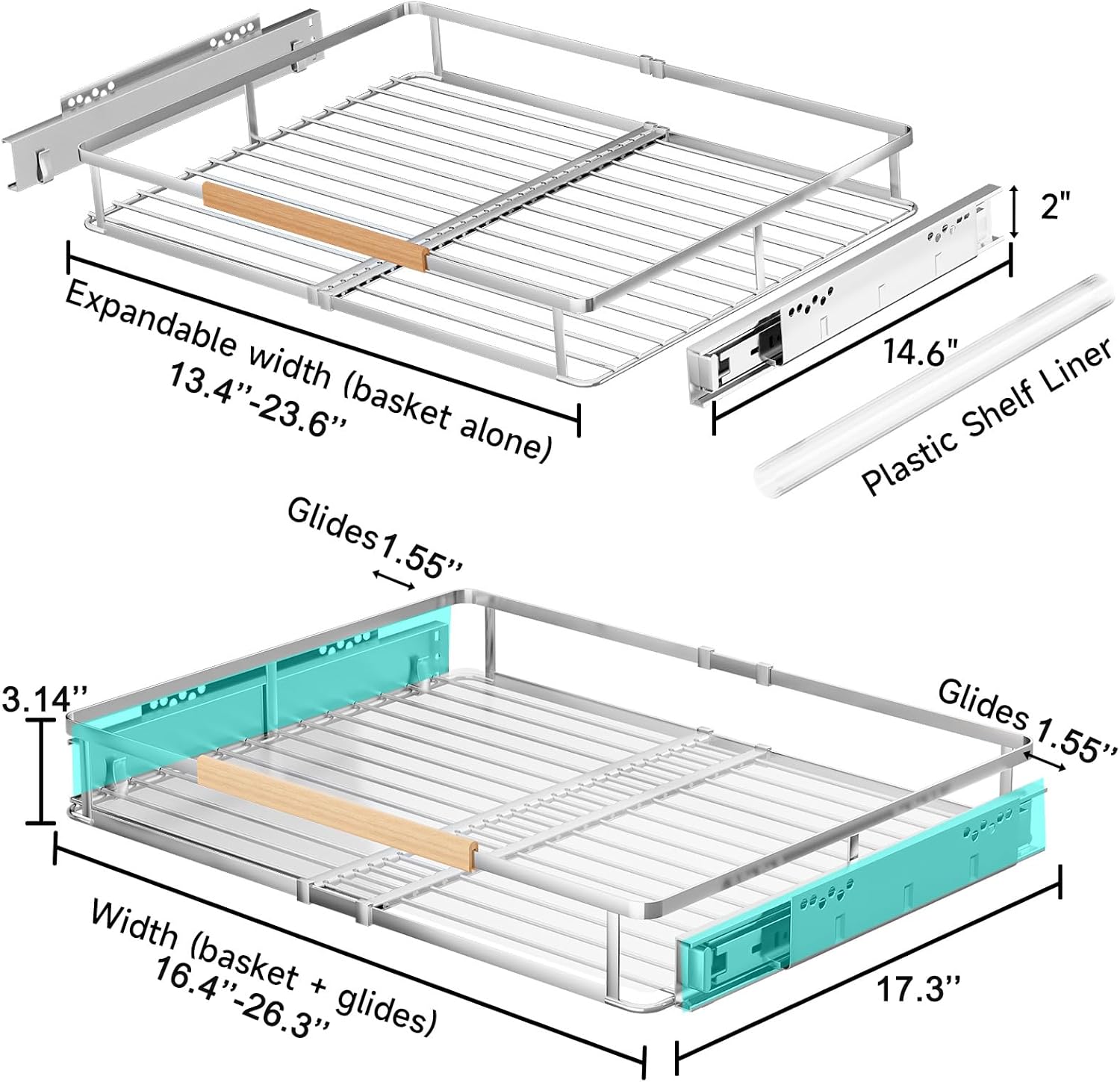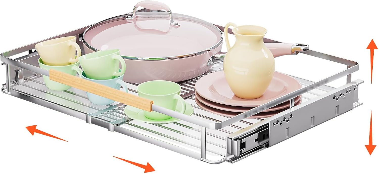 - Upgraded Expandable Design: This pull out cabinet shelf is designed to fit in most cabinets. The width of the wire basket can be adjusted from 16.3'' to 26.3''. Unlike the traditional bottom-mounted pull out cabinet organizer, our pull out cabinet organizer can not only expandable but also adjust the height to be installed on the side, not only at the bottom. The new expandable design gives you a better experience and saves your space.