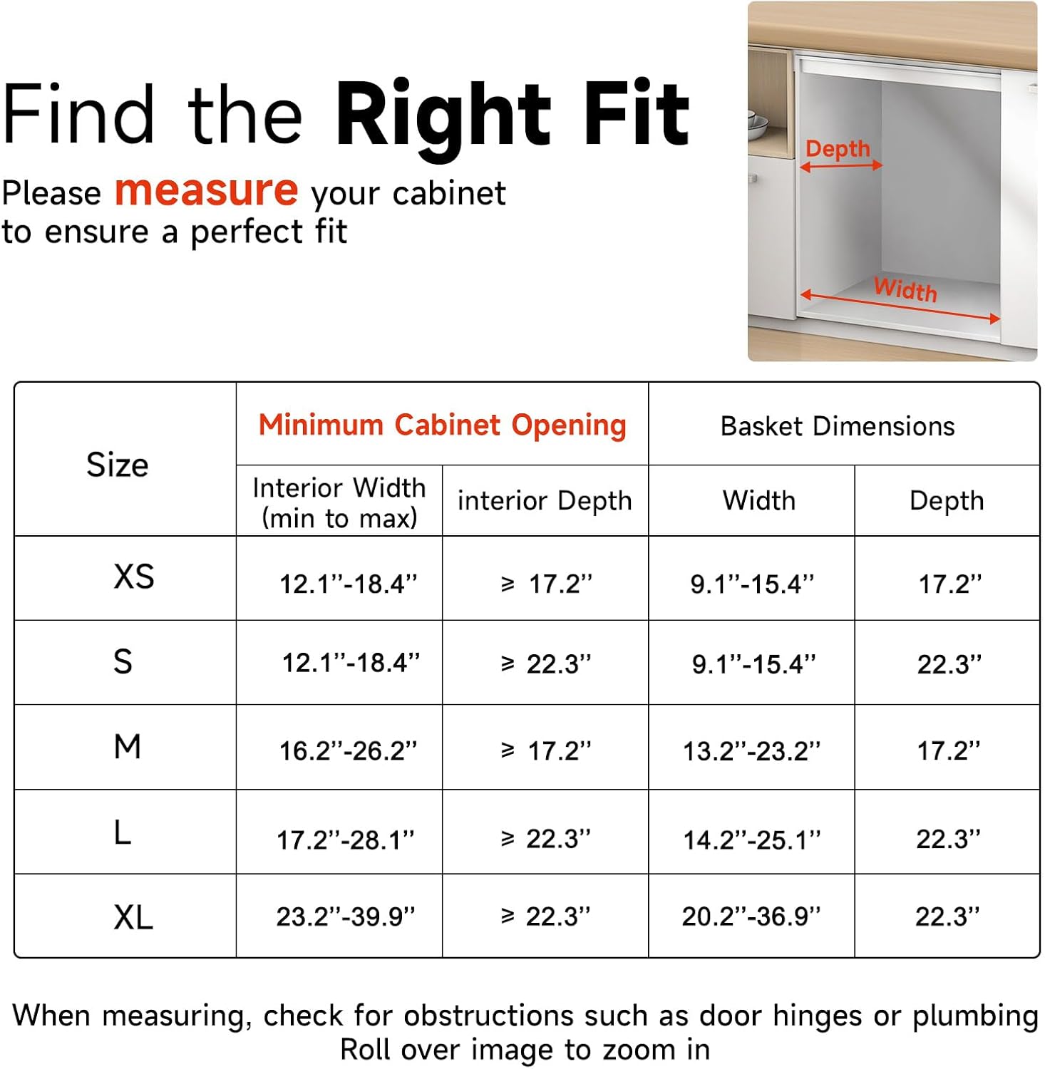 - Easy to Install: The slide out drawer is side-mounted. Follow the installation instructions step by step, measure the size of your cabinet and then hit the screws can be done easily. Please choose the size you need before you buy, please note that first measure the size of your cabinet before you buy, to avoid the trouble of return, It can fit in cabinets with a width of 17.1'' to 28'' and a depth of 22.5".