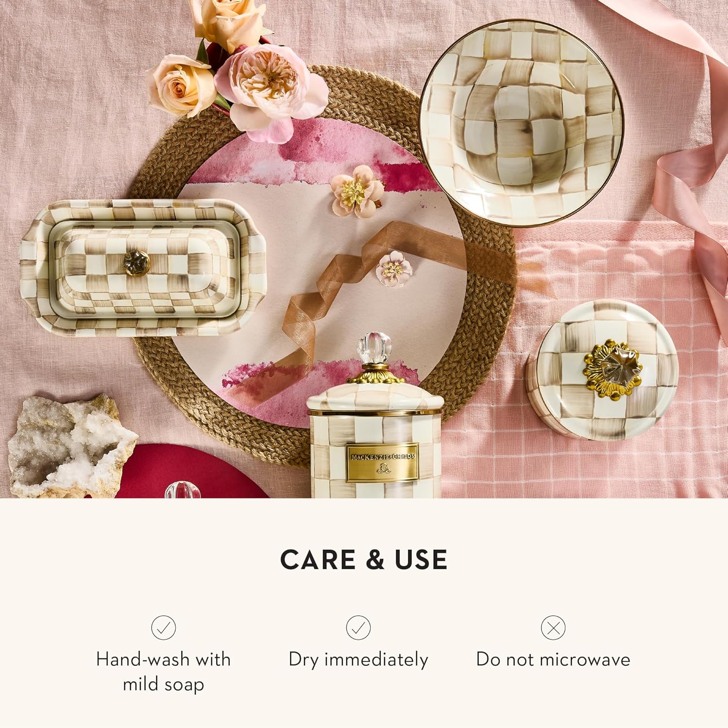 MACKENZIE-CHILDS Enamel Salad Serving Set, Enamel Bowl and Wooden Salad Servers, Decorative Kitchen Set, Brown-and-White Mocha Check
