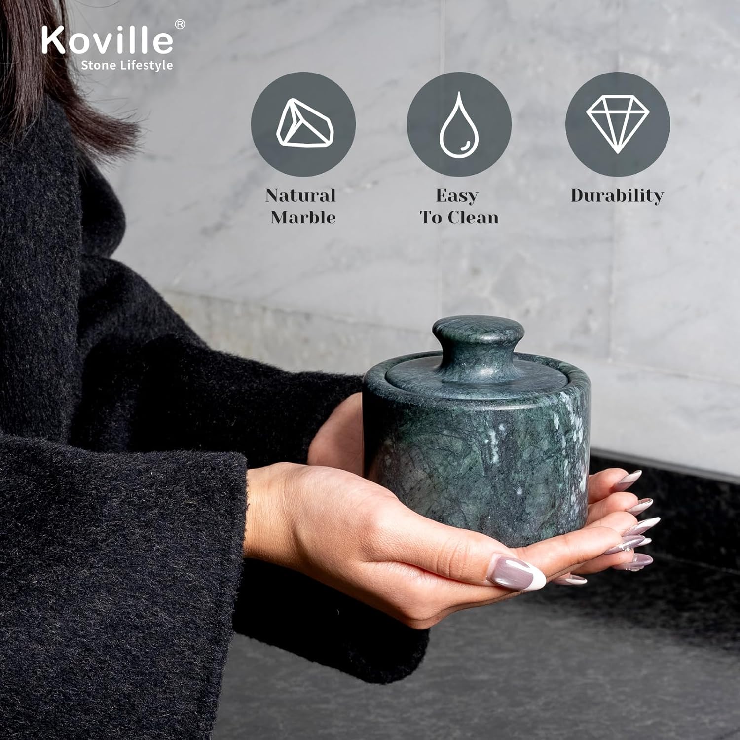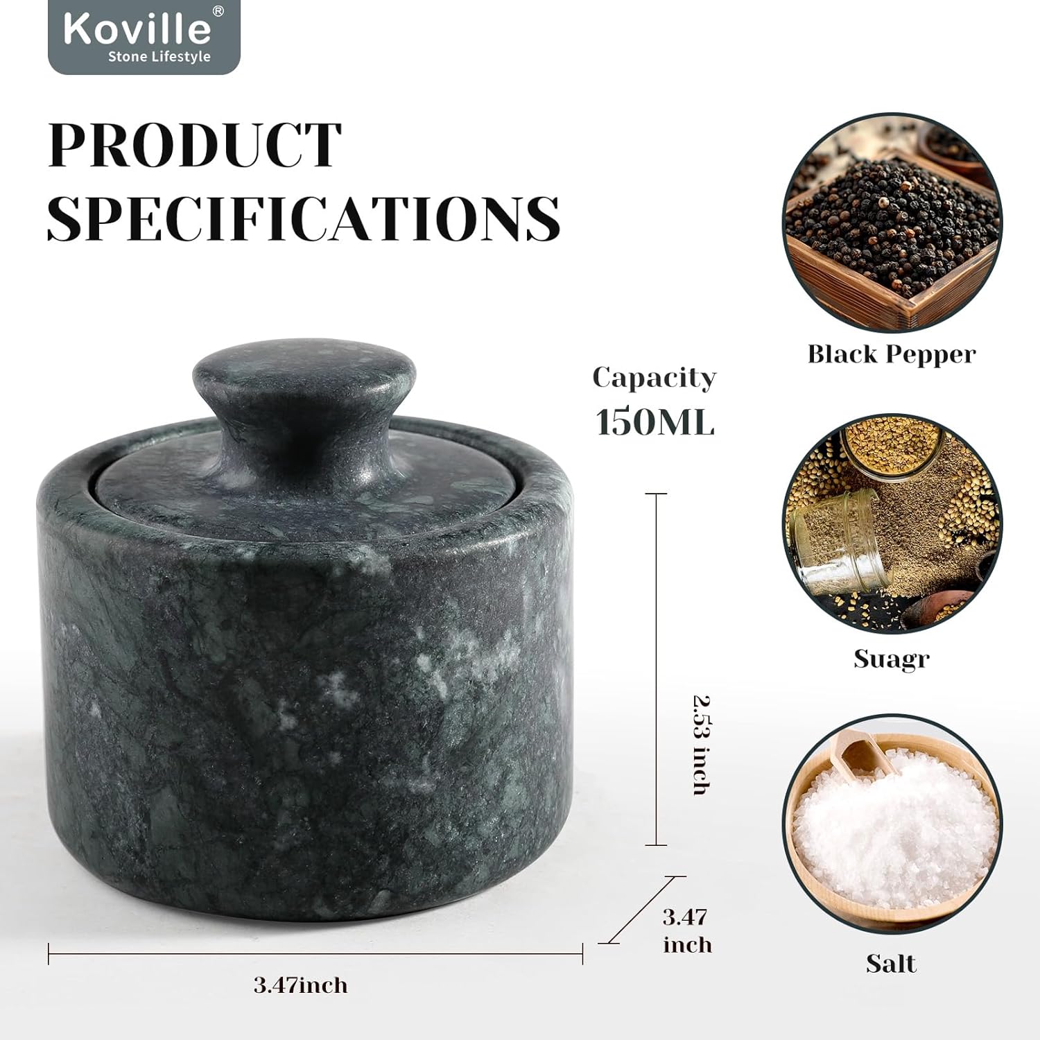 Koville Indian Green Marble Salt Cellar with Lid 3.5", Stone Pepper Container & Spice Jars for Kitchen, Marble Salt and Pepper Holder, Stone Storage Box for Kitchen Counter, Spice Jar