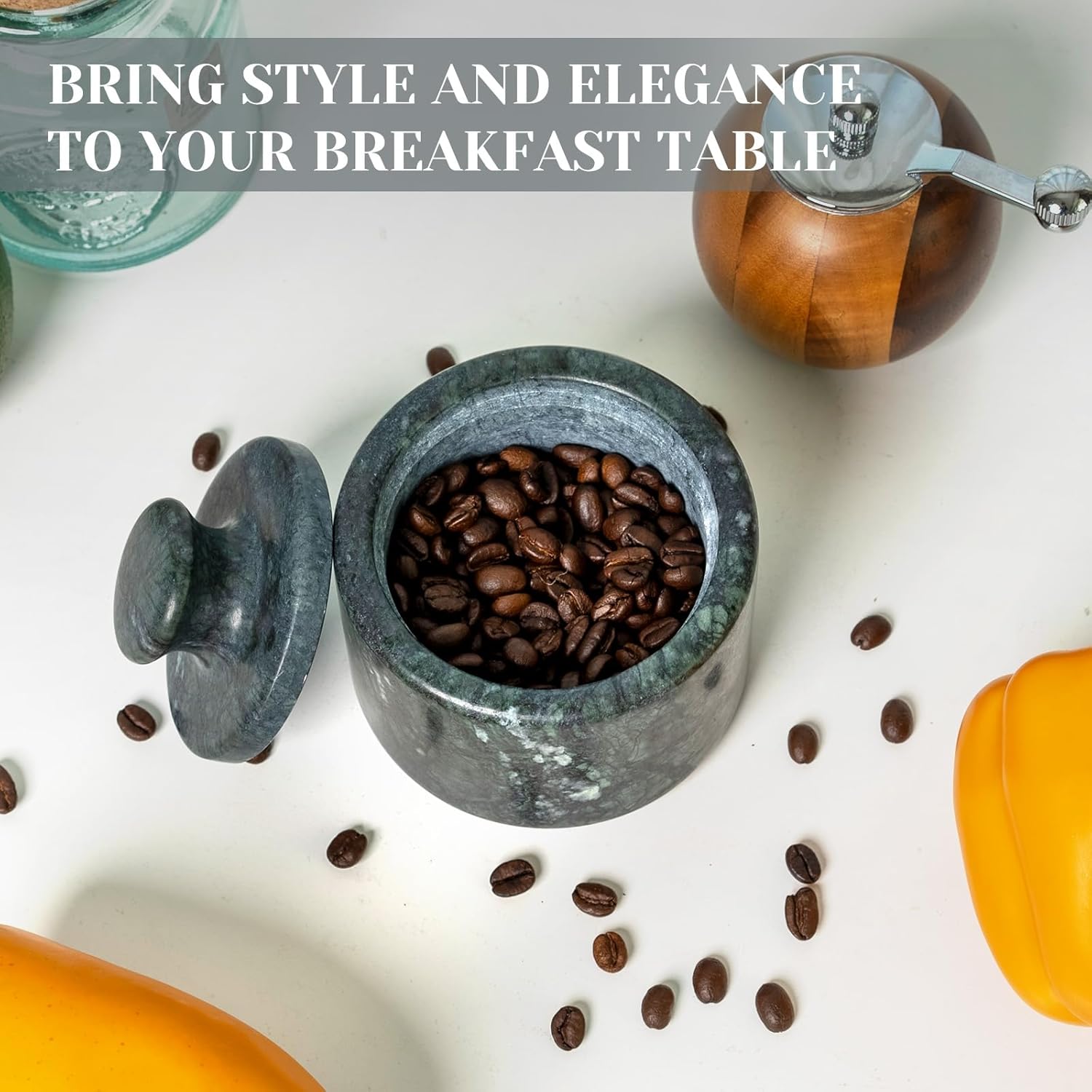 - Handcrafted from 100% Indian Green Marble Carefully carved from high-quality Indian green marble, known for its rich emerald tones and white-gold veining. Each jar is a natural work of art—no two are the same—offering a timeless aesthetic that elevates any kitchen or dining decor