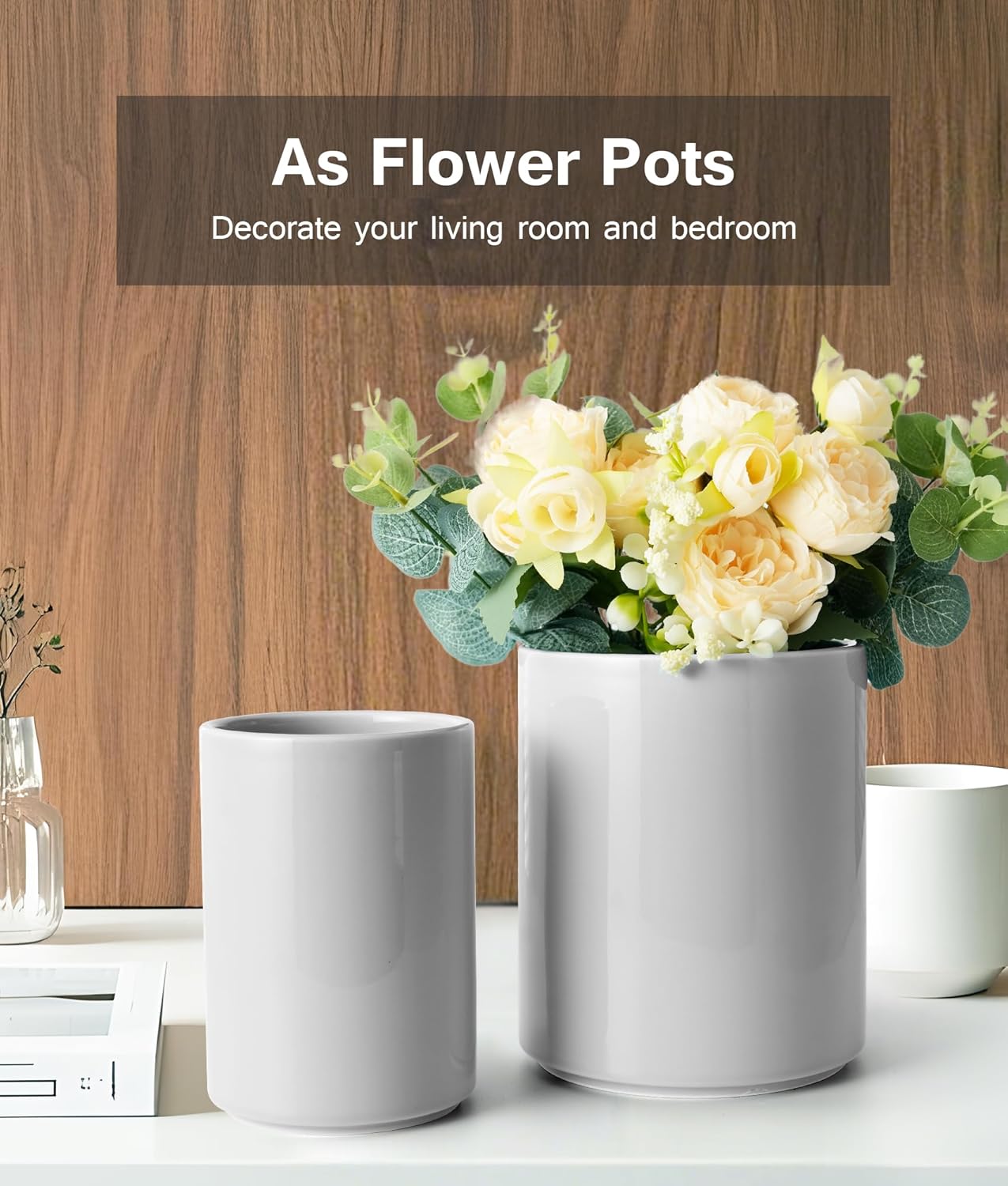 Set of 2 Utensil Holder, 7"+5" Ceramic Kitchen Utensil Holder for Countertop, Large Cooking Utensil Crocks for Counter, Morden Utensil Organizer for Spatula, Kitchen Decor (Grey)