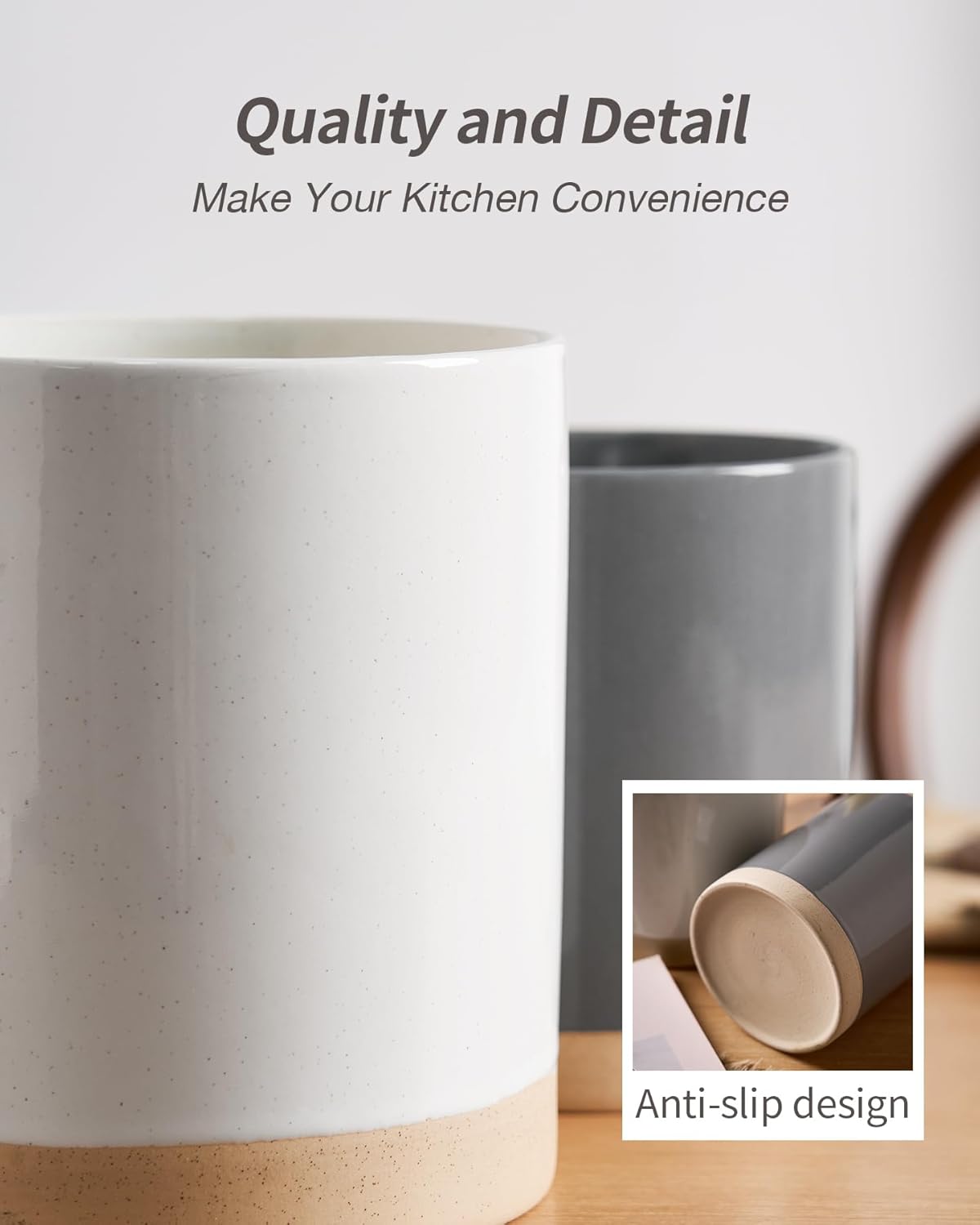 - 【Ideal Choice】The ceramic utensil holder for kitchen counter is suitable for everyone who loves life and loves cooking. If you or your side have such a hardworking friend or loved one, our product would be a great choice. It is also a thoughtful choice for birthdays, holidays, anniversaries or any other occasion. Its simple yet elegant design makes it easy to incorporate into any modern / farmhouse style or decor, clean look that is sure to impress.