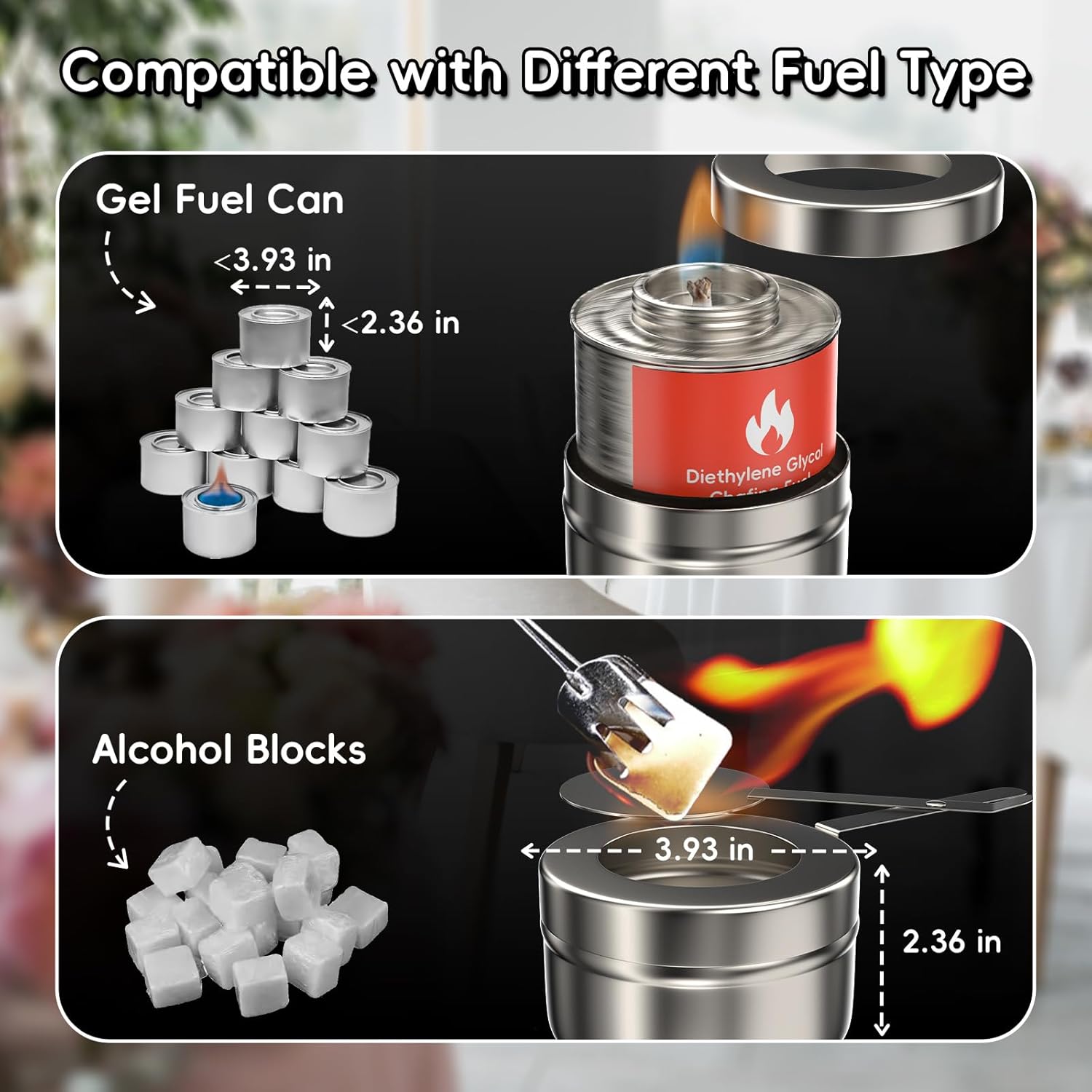- SUITABLE FOR DIFFERENT TYPES OF FUEL: This chafing dish buffet set is suitable for gel fuel cans and alcohol blocks. It does not require electricity to drive and eliminates the trouble of wires. It is compatible with both outdoor and indoor use and is very safe and reliable