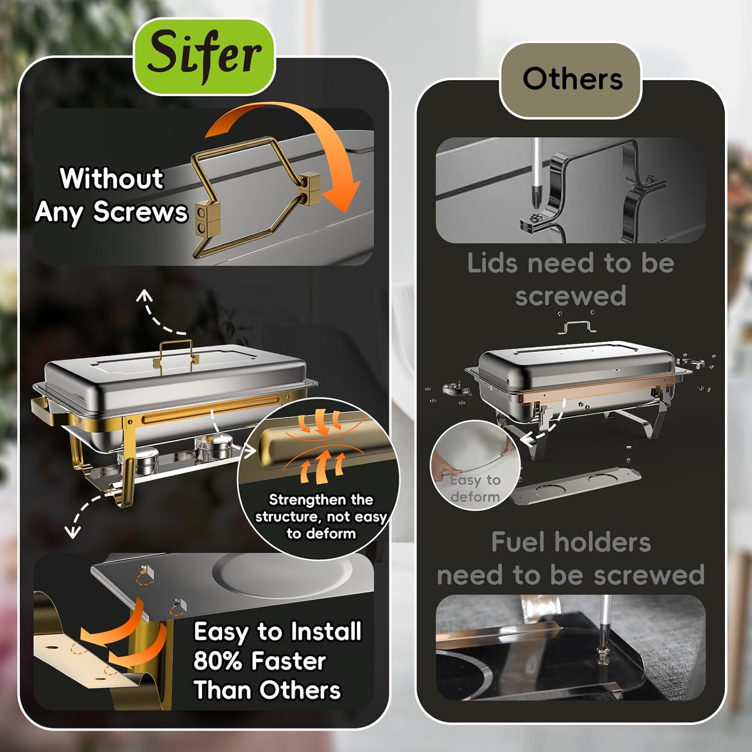 - SCREW FREE INSTALLATION: This chafing dishes for buffet do not require screws for installation at all. Not only is the installation simple and fast, but there is also no need to worry about losing any screws, which may affect secondary use. You do not need to think about any questions related to screws anymore
