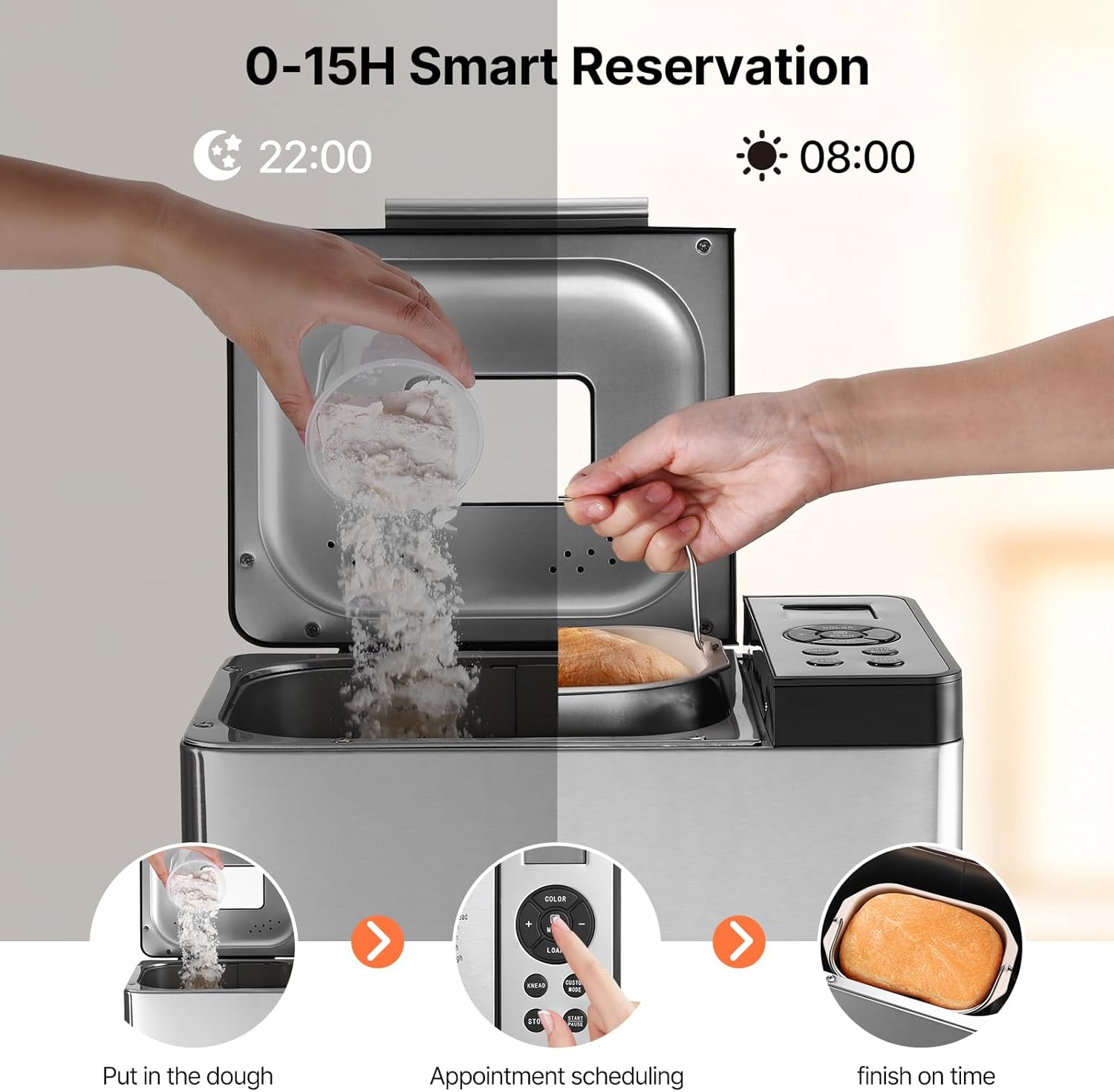 - 15-Hour Smart Reservation: Our dough maker features a 0-15 hour delay start and 1-hour automatic keep warm function. By scheduling in advance, you can always have freshly baked and warm bread ready. It also comes with a power interruption memory function, which resumes the original work within 15 minutes of an unexpected power outage, providing stable assurance for your baking.