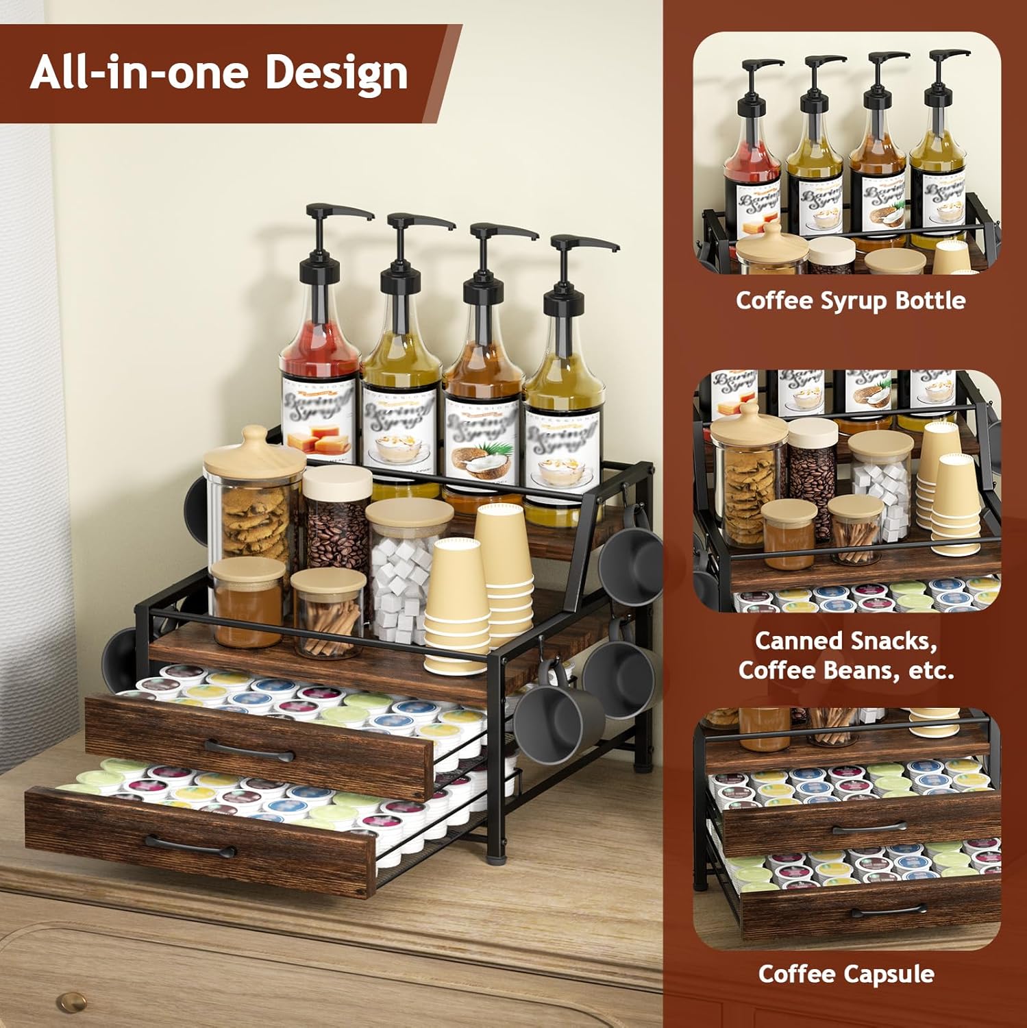 - [Safe & Secure] We know you want the best for your coffee setup, and we’ve got you covered. The thoughtful design of each tier ensures that your syrup bottles, pods, and accessories stay in place, preventing spills or accidents. It’s the peace of mind you deserve, so you can enjoy your coffee time without a worry.