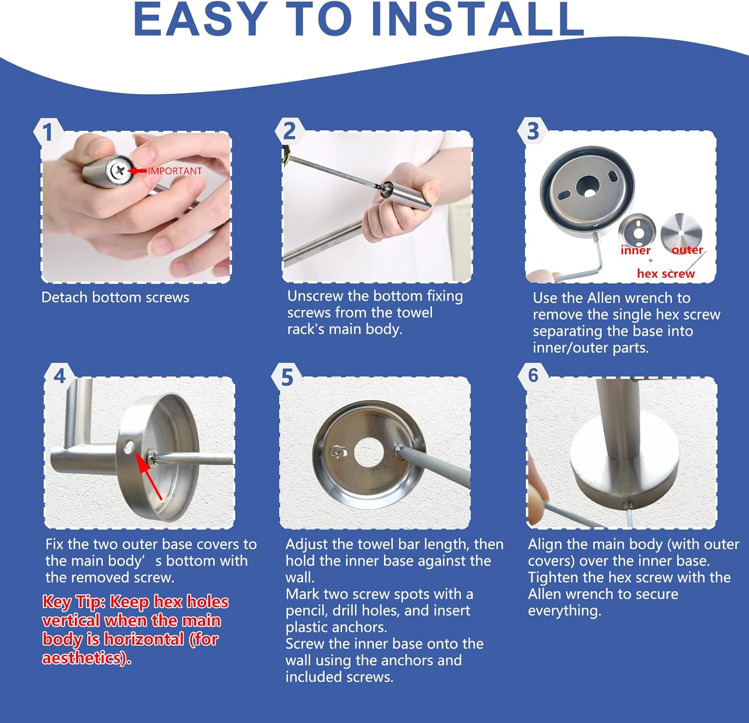 - Modern And Stylish Design: The Towel Bar Features a Sleek And Modern Design With Concealed Screws. It Not Only Covers Old Holes But Also Allows For Adjustable Installation Angles And Lengths, Ensuring a Clean And Stylish Appearance On Your Wall.