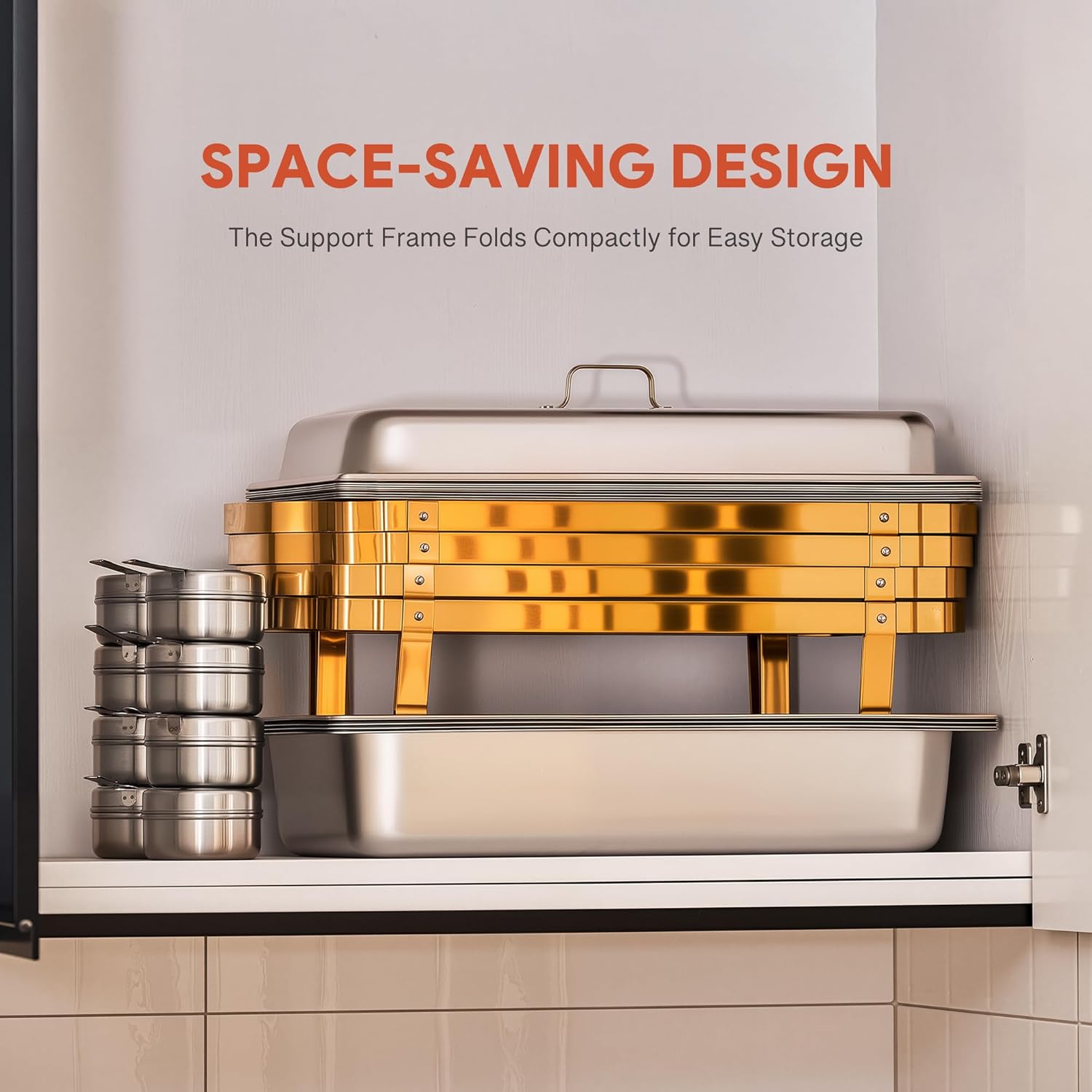 - Foldable for Compact Storage: Our chafing dishes for buffet take up little space when not in use thanks to their foldable legs and stackable pans, allowing for easy storage, organization, and transport from shelf to table