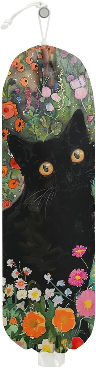 Flower Cat Plastic Bag Holder, Wall Mount Grocery Bag Holder, Plastic Storage bag, Pull Rope Free Adjustment, Plastic Bag Holders for Grocery Bags, Plastic Bag Dispenser for Home Kitchen Pantry