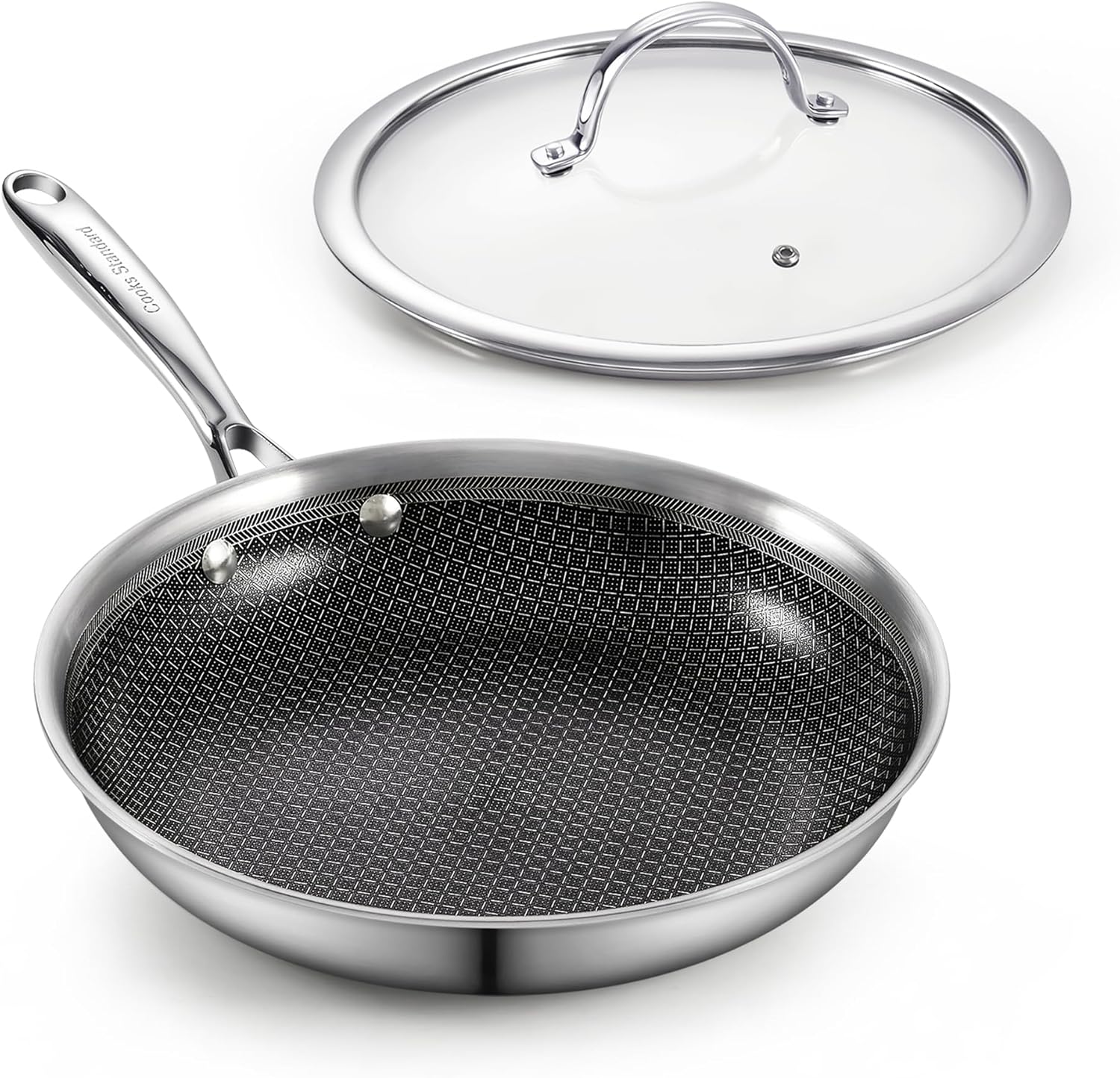 - Laser-Etched Hybrid Nonstick: The surface of the stainless steel skillet features precision laser-etched textures, combined with a health-conscious nonstick coating, providing enhanced durability, scratch resistance, and long-lasting nonstick performance