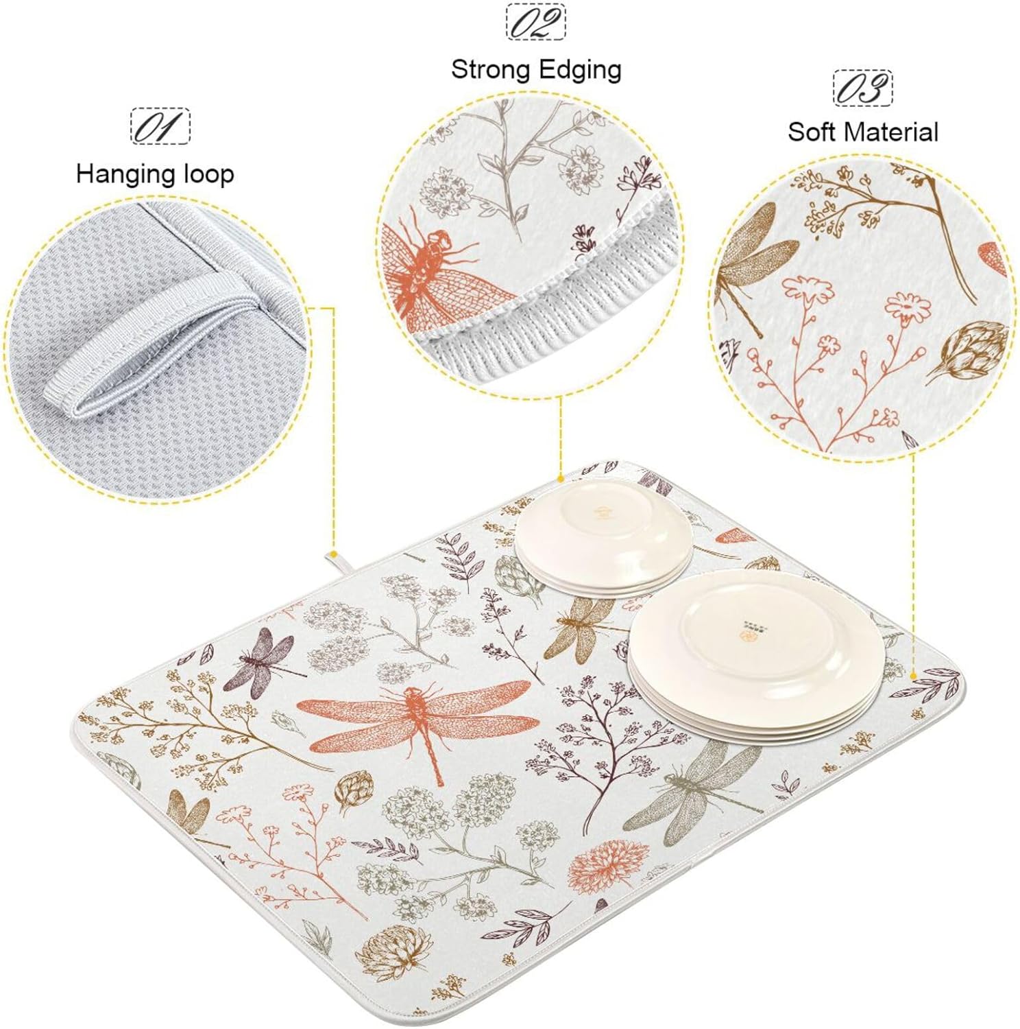 Dragonfly Botanical Plant Dish Drying Mat for Kitchen Counter Absorbent Microfiber Drying Pad, Large 18x24 in, Reversible Drainer Mats