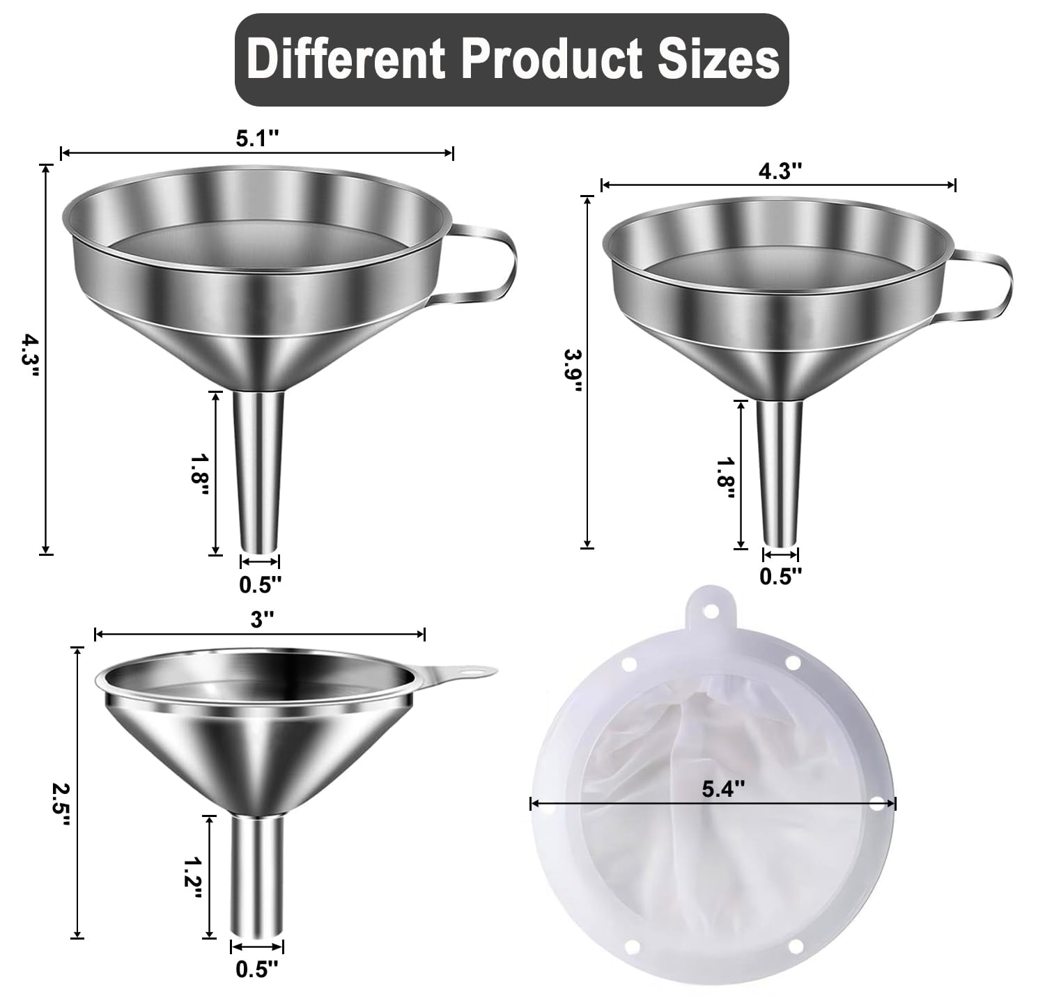- [Narrow stem design] Funnels for kitchen use filling bottles,Tapered spouts target narrow containers: essential oil droppers, spice jars,Reinforced rims prevent spills with bulk ingredients (coffee beans, rice). Includes 2 stainless steel strainers:Fine mesh (0.05” holes): Filters pulp from juices/herbal infusions,Medium mesh (0.2”holes): Sifts powdered sugar/catches herb stems
