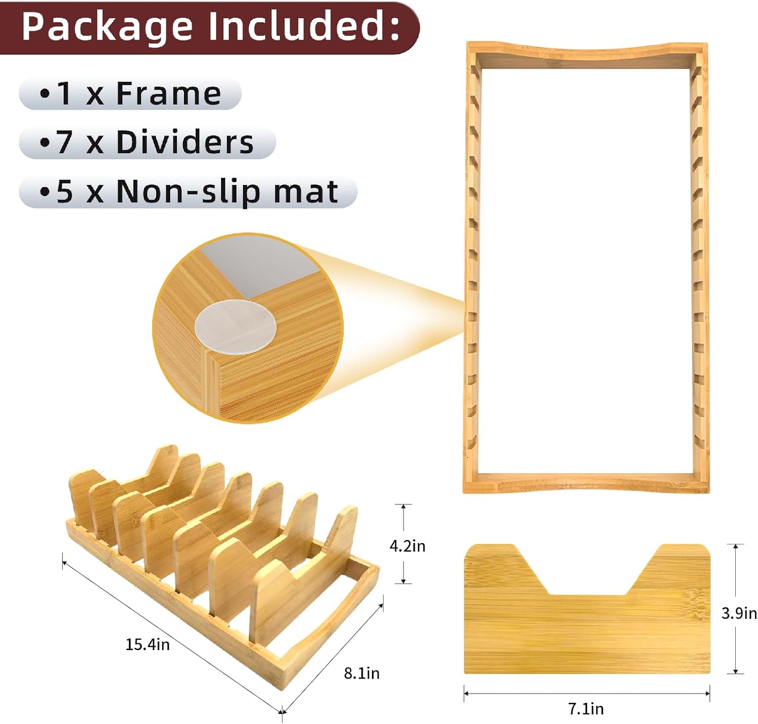 - Versatile Bamboo Pot Lid Organizer: Revamp your kitchen storage with our 15.4 x 8.1 x 4.2-inch bamboo pot lid holder; Pan organizers inside cabinet has 7 adjustable dividers and 13 customizable slots, itโs designed to adapt to your unique needs