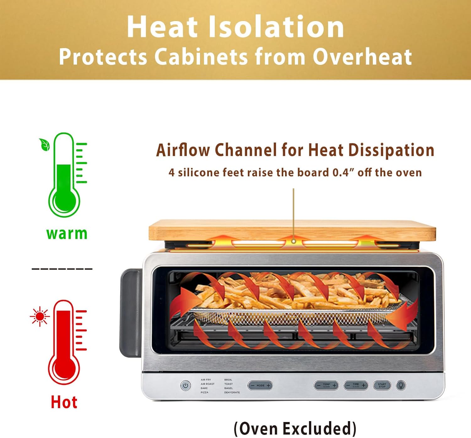 - Bamboo cutting board sitting on Convection Oven (Oven Excluded) : Designed to be compatible with SP151. Sits steadily on the oven, protects cabinets from being damaged and protects family and pets from getting hurt by heat.