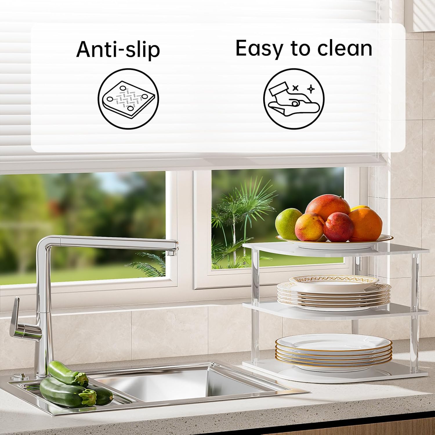 - MULTIFUNCTIONAL KITCHEN ORGANIZATION: All acrylic multi-tiered corner shelf design, both professional dinner plate rack can also be transformed into a kitchen dish storage layer or spice rack, bowl organizer in tight spaces. Perfect replacement for bulky bamboo corner racks, bathroom countertop corners can also store toiletries. It can help you make your home more tidy.