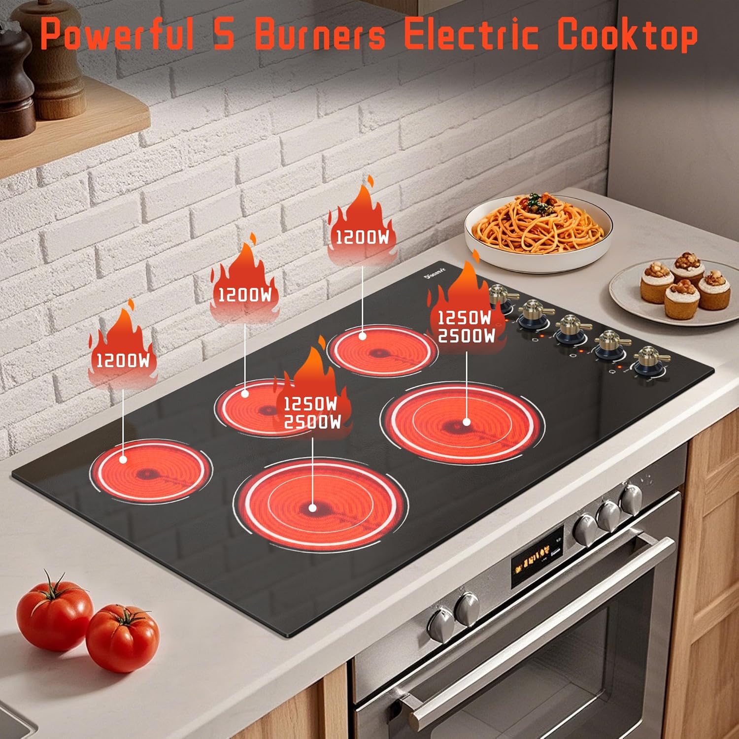 - š¢| 8400W High Power & 9 Heating Levels | The total power of this 5 burners electric cooktop is 8400W (1000+1200+1200+2500+2500W). The bottom two burners are both expandable burner and can provide higher power, suitable for larger pots. Each burner has 9 power levels to meet your needs for better temperature control and variety of cooking styles like braise, fry, simmer, steaming, boil, stir-frying, or roast.