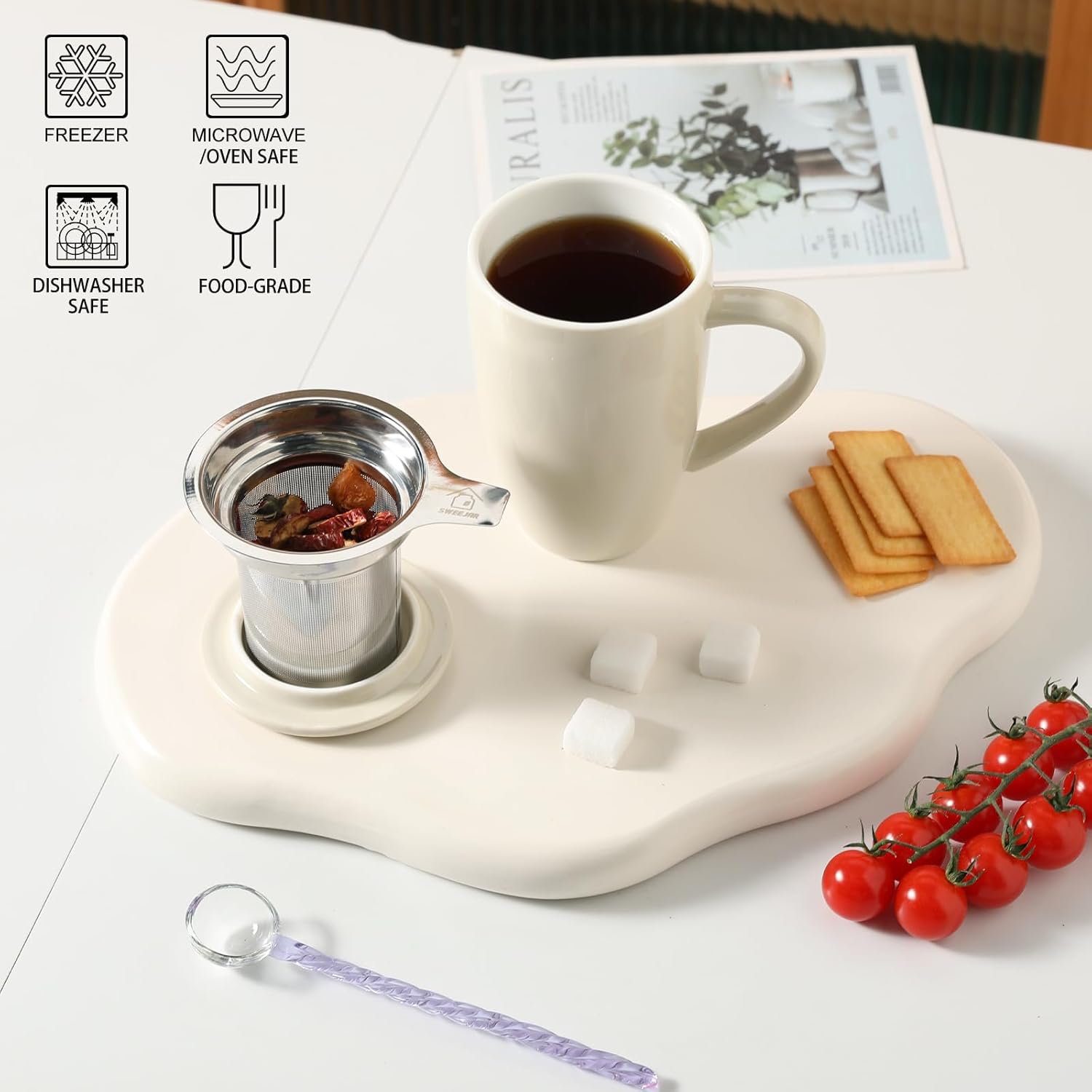 - Durable Material—Sweejar cup is made of reliable porcelain which is breakage-proof. The tea infuser is 18/8 stainless steel. The lid can be used as a tray for the infuser.Ceramic cups is safe for and dishwasher easy to clean.