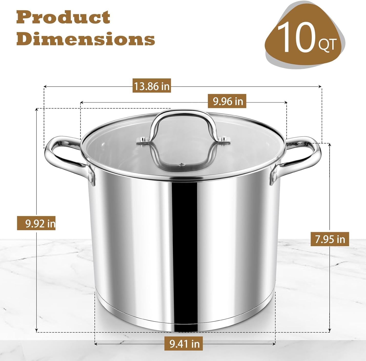 P&P CHEF 10 Quarts Cooking Stock Pot with Lid, Stainless Steel Stockpot Induction Pot for Soup, Tri-Ply Bottom & Clear Glass Lid & Double Handle, Dishwasher Safe
