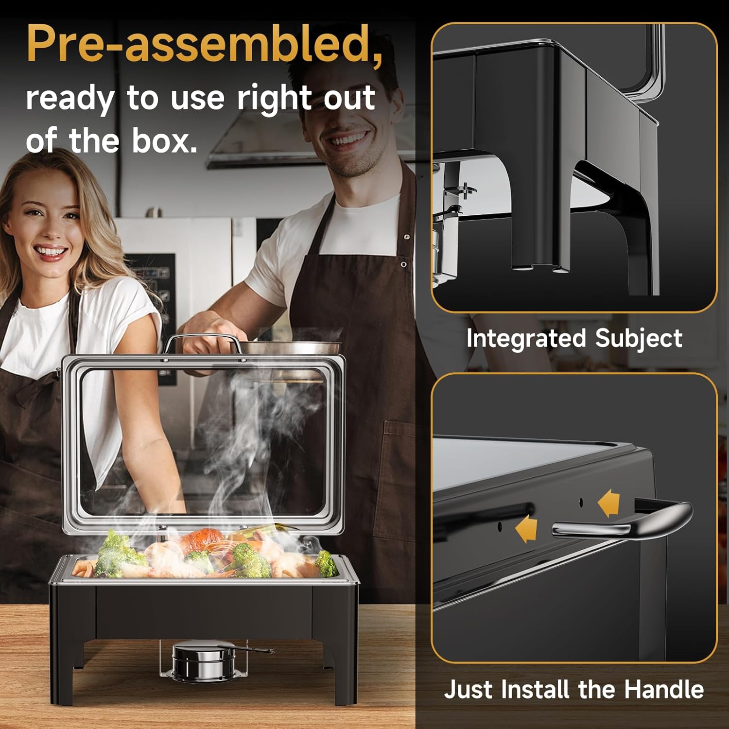 - Tool-Free Setup – Fast & Frustration-Free No complicated assembly required—just attach the handle and go. This chafing dish buffet set is designed for quick, smooth service every time.