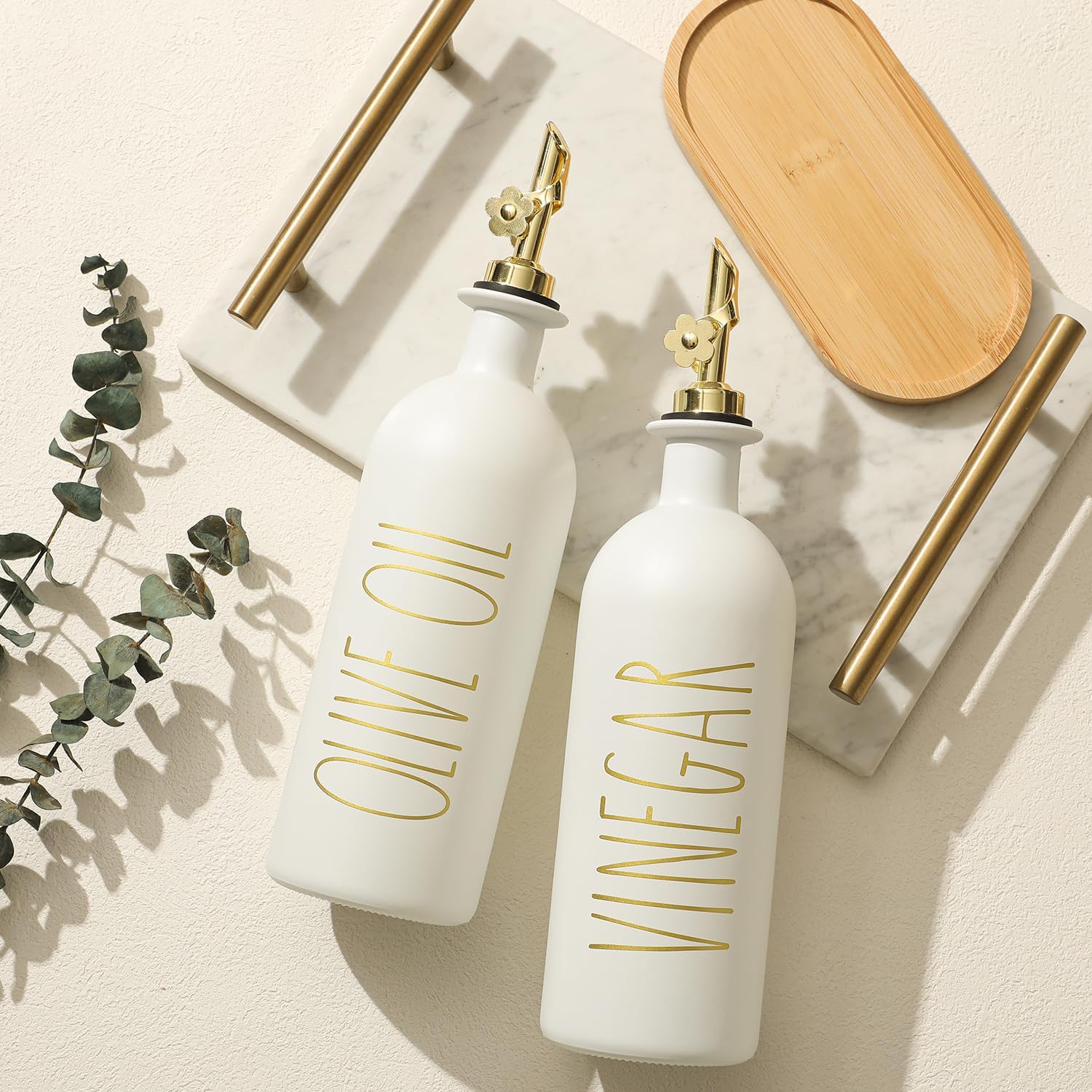- MODERN FARMHOUSE DESIGN - Worthy of sitting on your kitchen counter, The olive oil bottle dispenser printed the beautifully Olive Oil and Vinegar label which can help you identify them easily, both decorative and practical, this vinegar and oil dispenser bottles not only kitchen oil dispenser, but also farmhouse kitchen dΓ©cor.