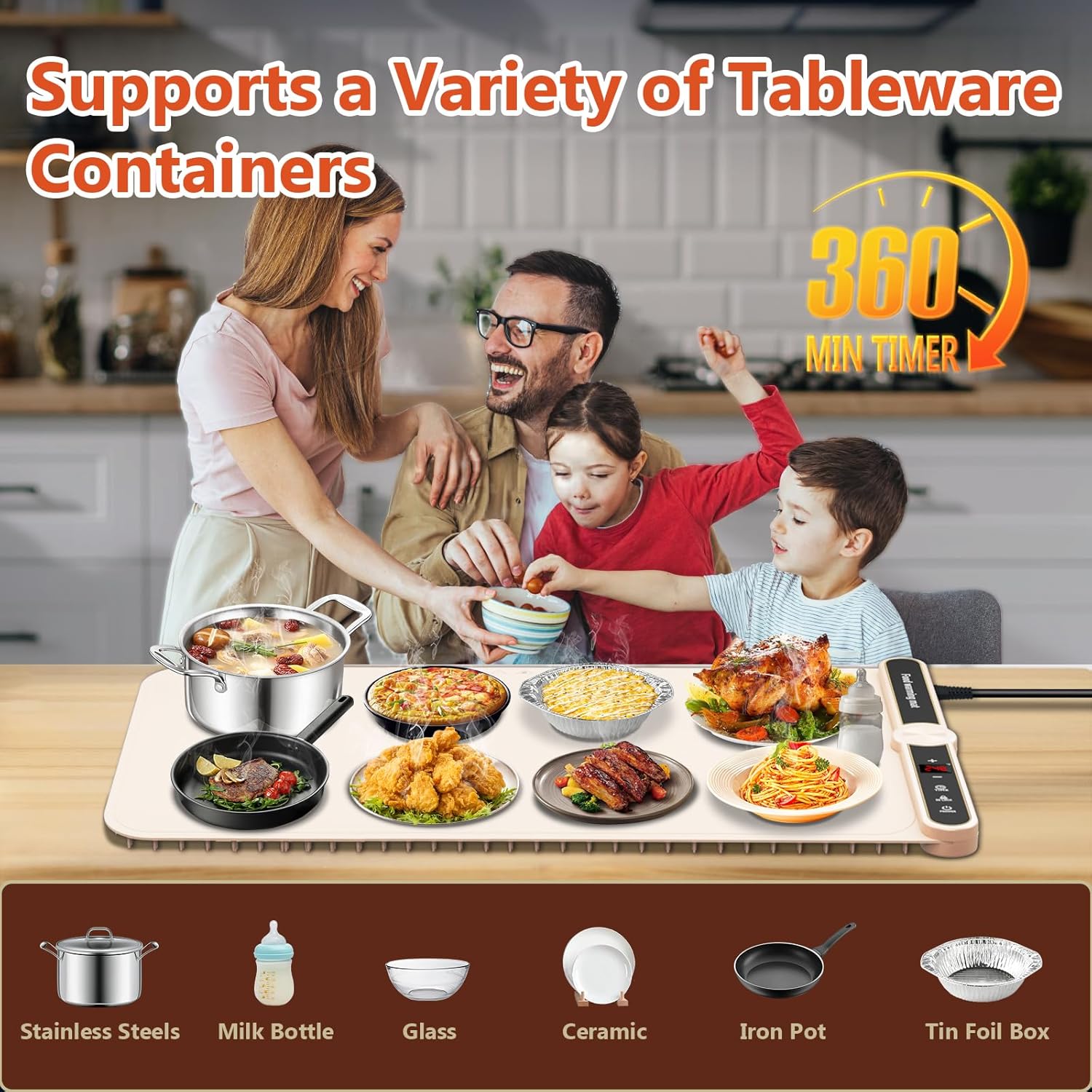 - 【Multi-Functional Kitchen Helper】The warming mat for food extra large is a multi-functional home helper for all kinds of heat-resistant materials, such as glass, stainless steel, ceramic, etc.; it not only keeps dishes warm during daily meals, but also helps to heat milk, thaw steak, ferment dough, etc., suitable for all seasons, can be used anytime, anywhere, keep dishes warm for family gatherings, parties, buffets, festivals, and other celebrations, always maintain the best taste